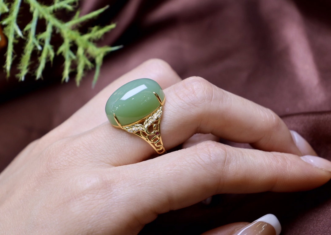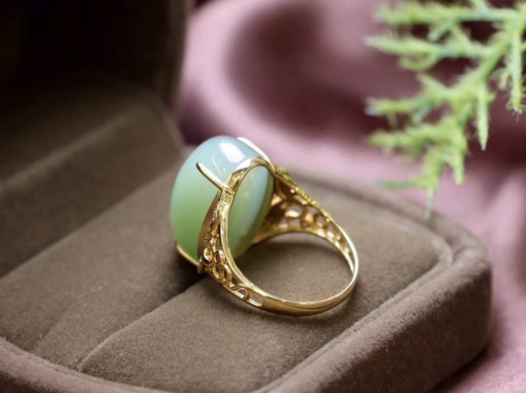 元宵节礼品天然新疆和田玉戒指女 粉绿碧玉蛋面镶18k金指环送妈妈