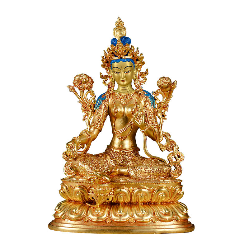 欧斯特 家居饰品绿度母中式摆件7寸 客厅玄关铜鎏金雕花家居铜像
