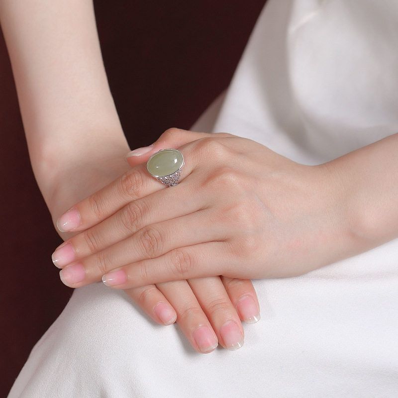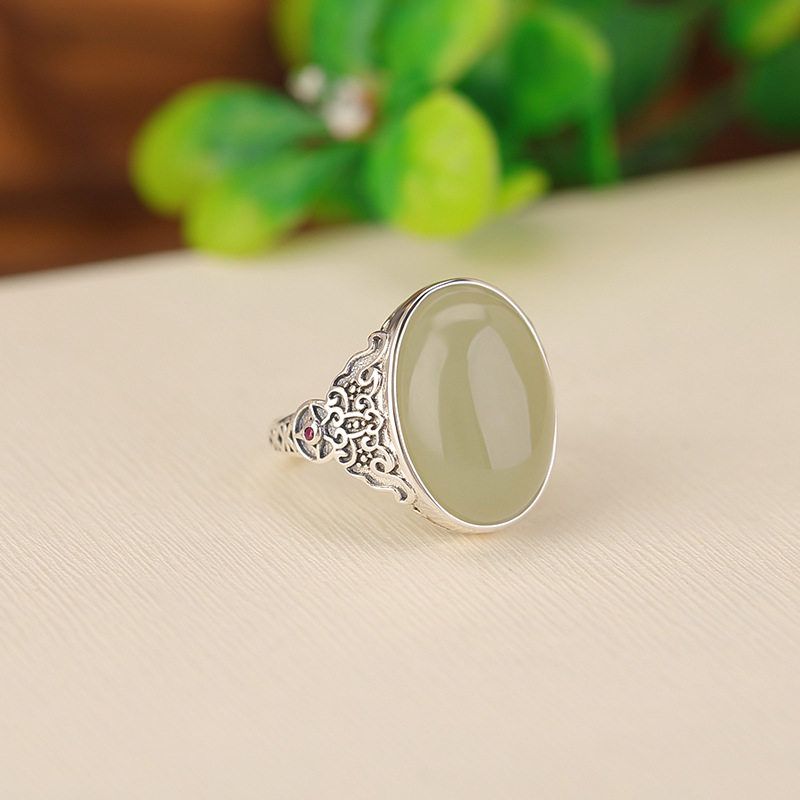 925纯银天然晴水和田玉复古做旧新中式简约蛋面戒指民族风指环