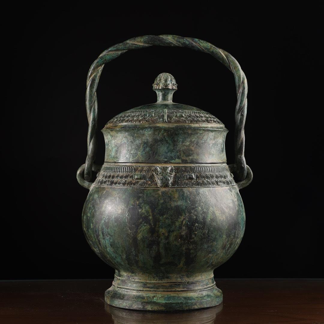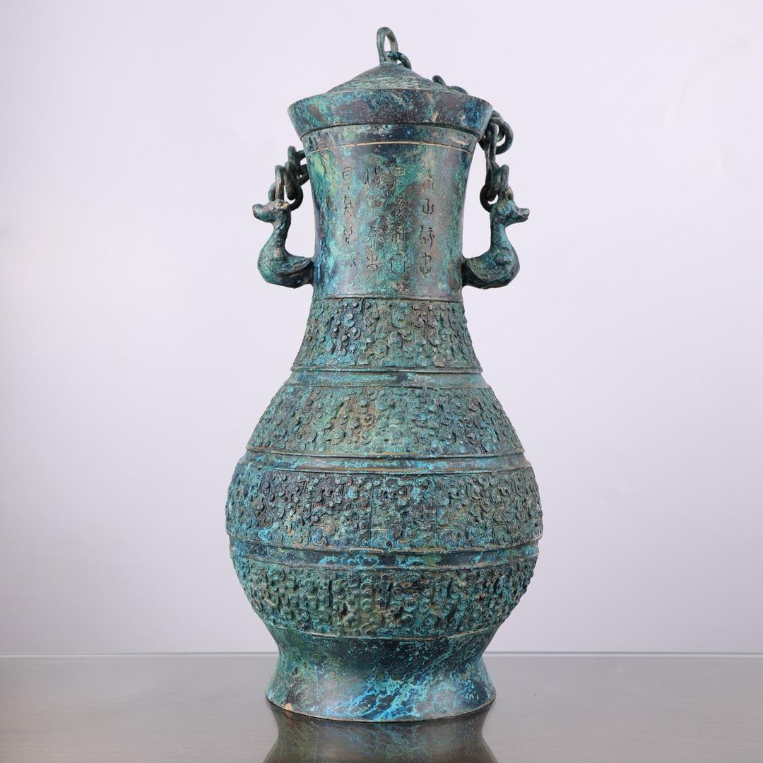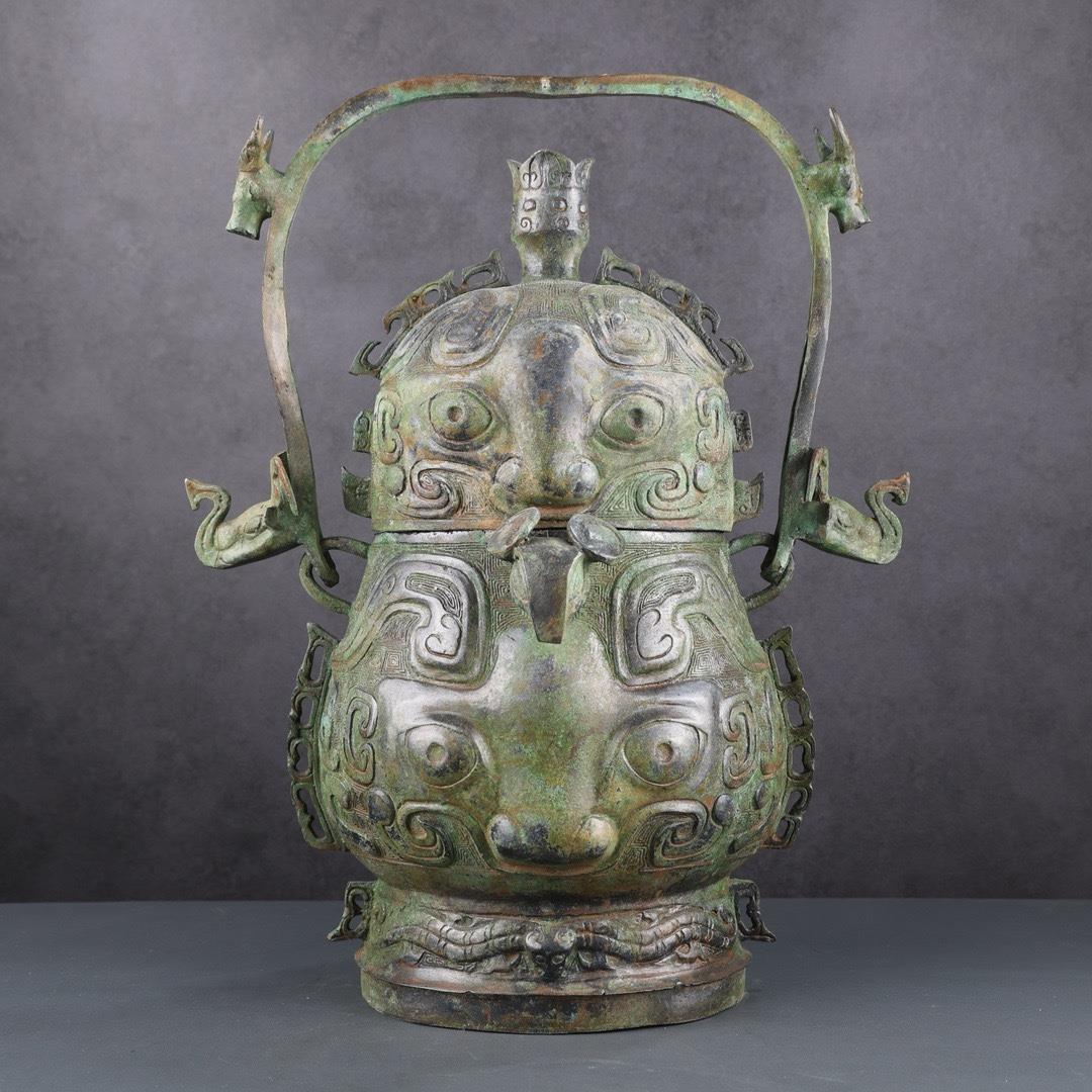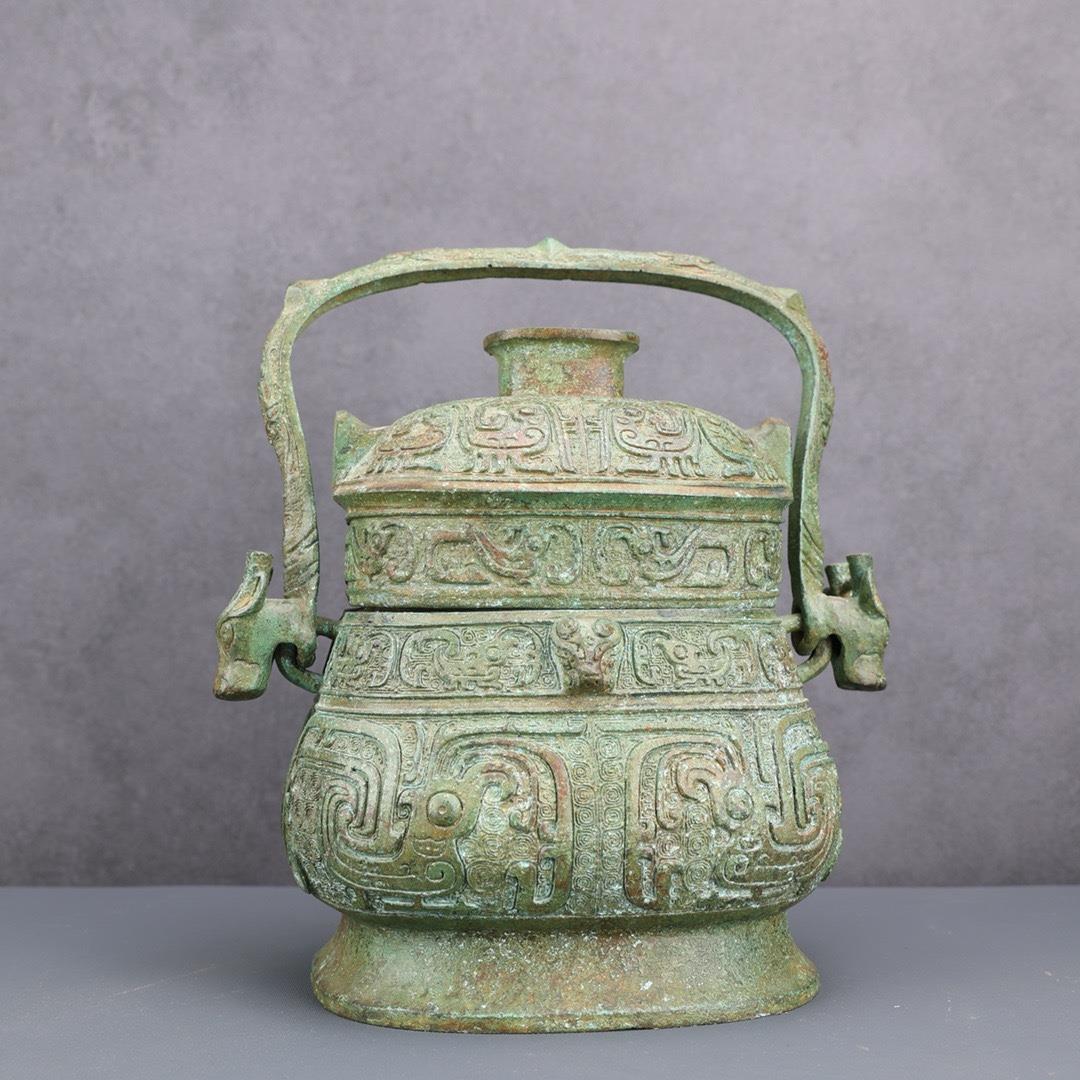 仿古青铜器做旧青铜器虎食人卣盛酒器鸮卣提梁错金银神面摆件酒器