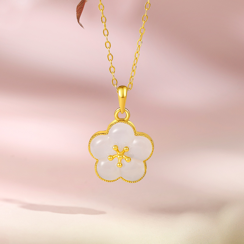 周六福旗舰店和田玉吊坠女金镶玉足金梅花白玉玉坠挂件节日礼物