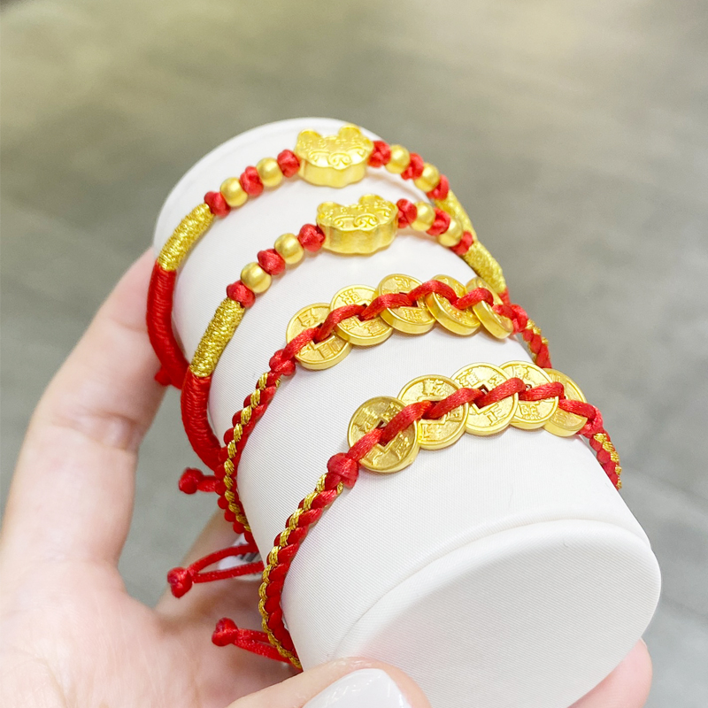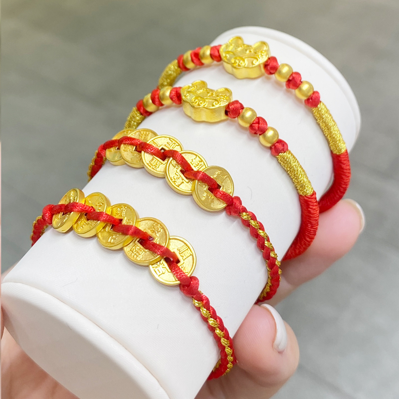 999足金五帝币平安宝宝婴儿礼物情侣男女款黄金手链转运珠硬金