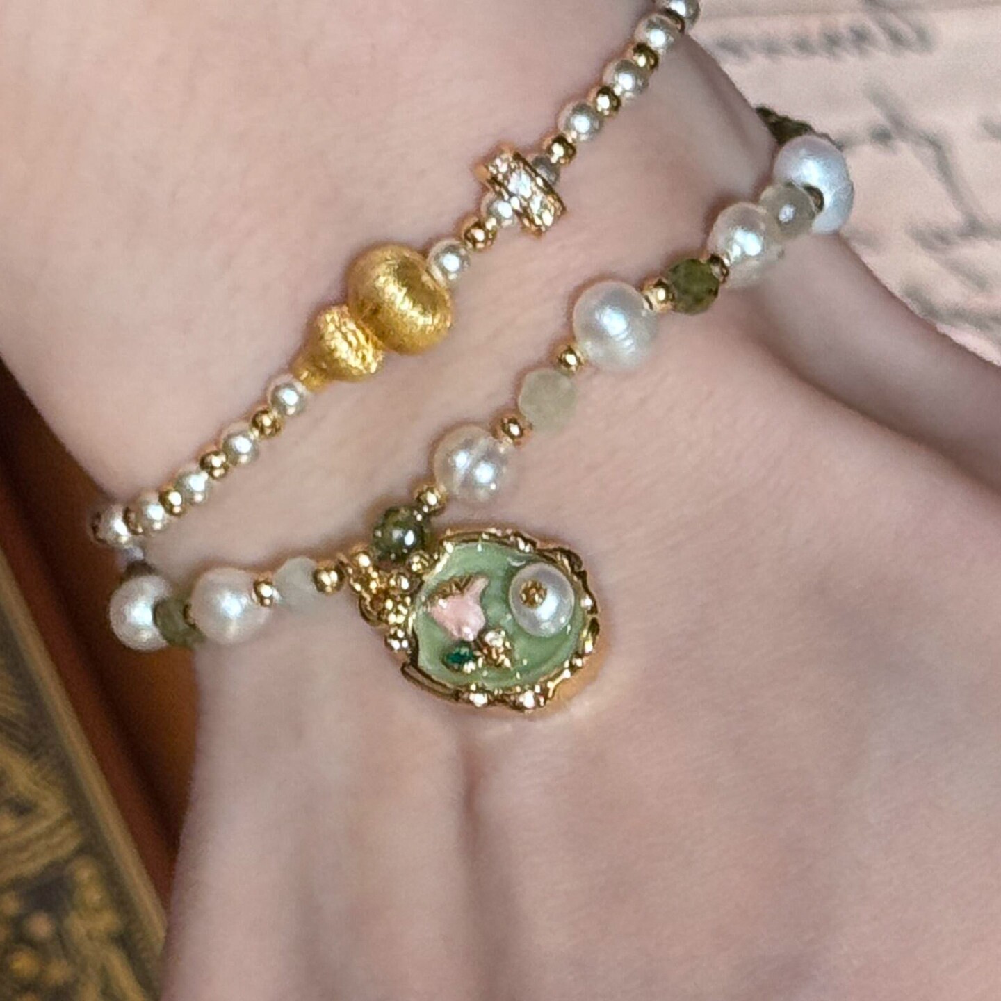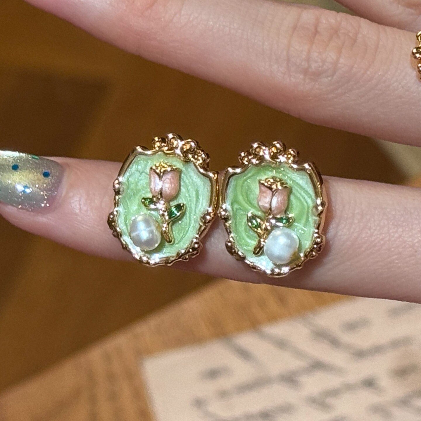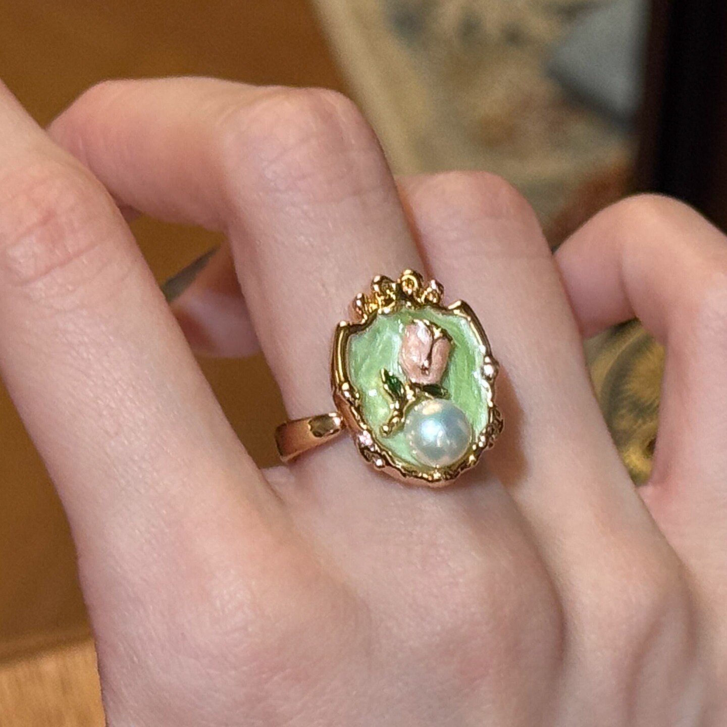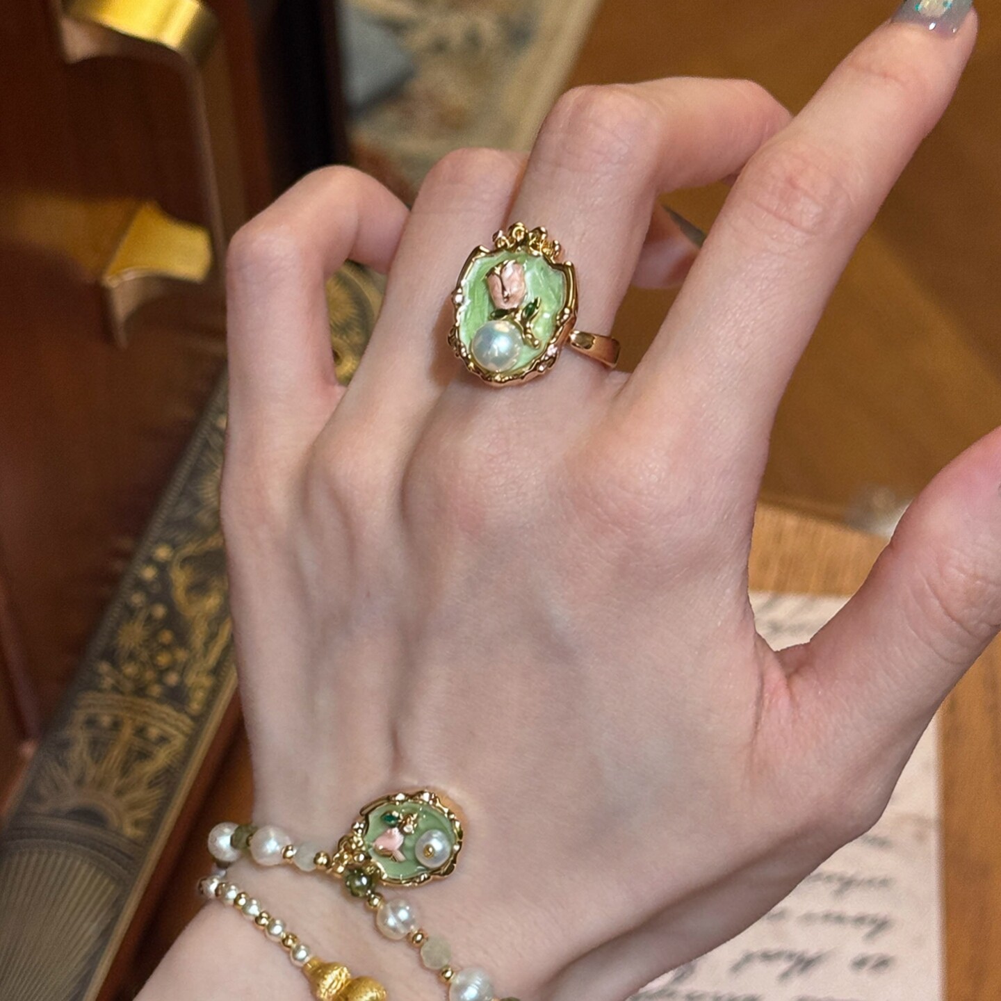 中古滴釉绿色油画风仿珍珠玫瑰花戒指高级感法式宫廷风百搭食指戒