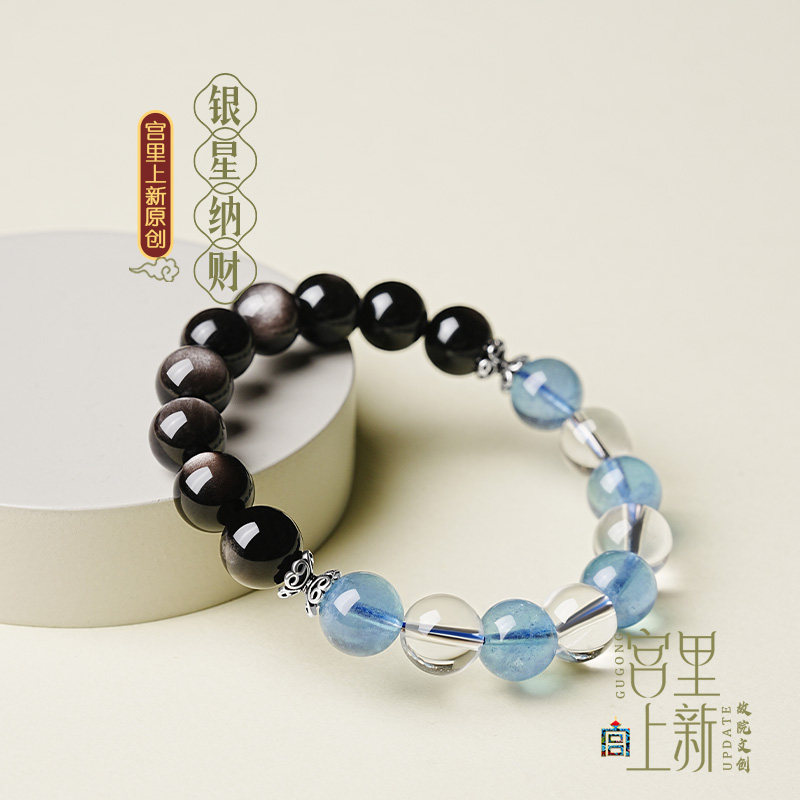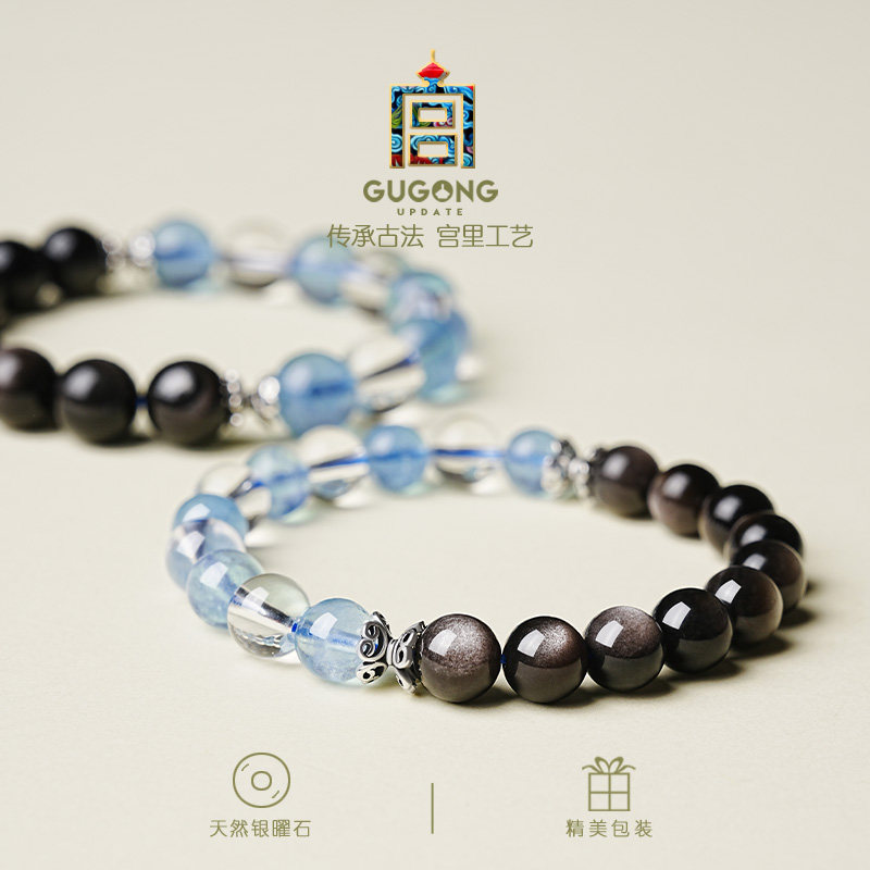 宫里上新黑曜石手串女款海蓝宝蓝色水晶手链生日母亲节礼物送妈妈