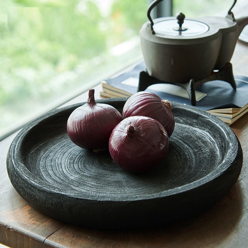 高级复古黑色泡桐木层叠烛台圆形果盘摆件客厅样板间居家艺术装饰