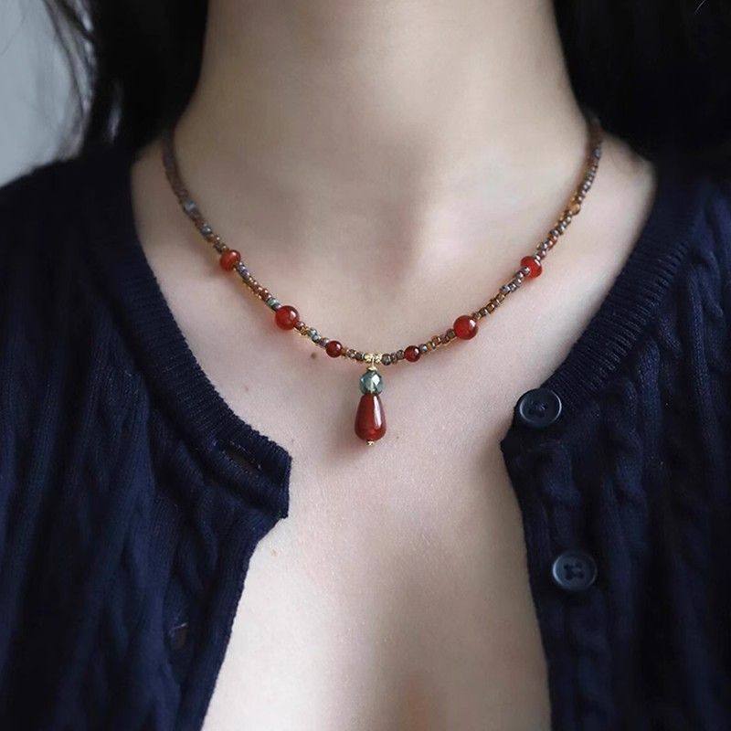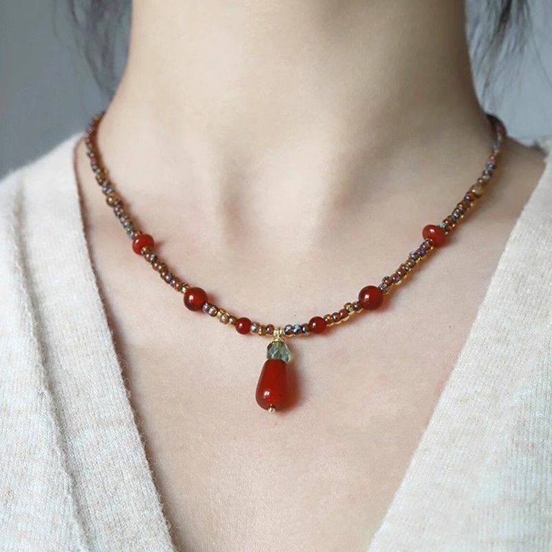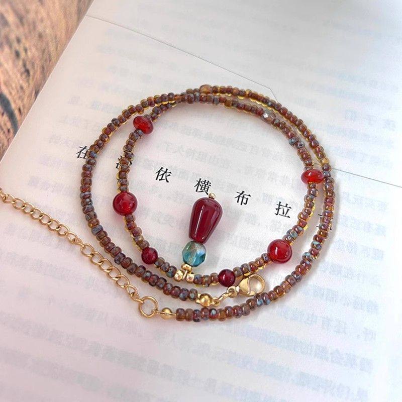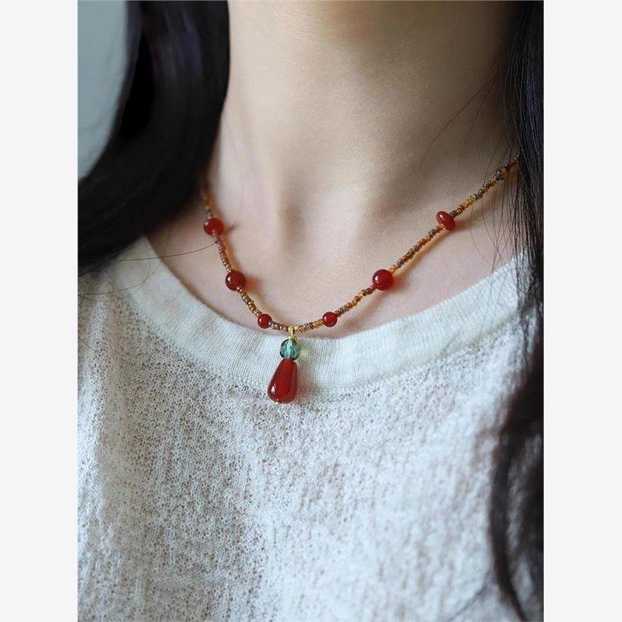 新中式捷克珠红珠珠项链复古高级感敦煌风红色显白锁骨链