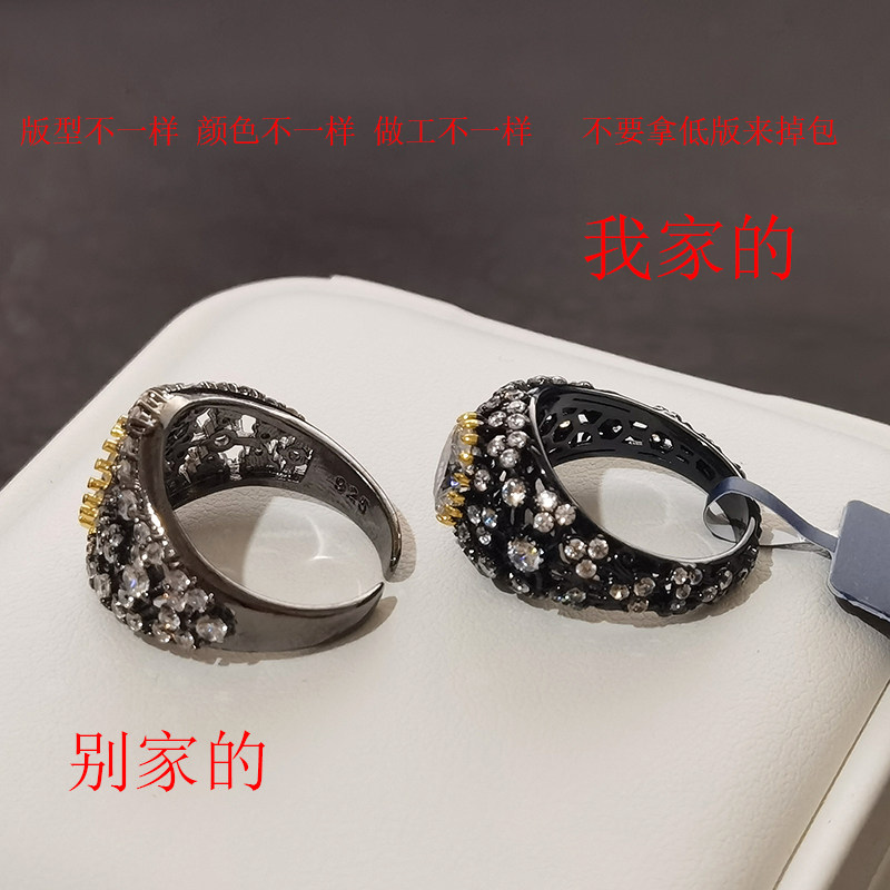 小众复古意大利精工雕花925纯银镀K金镂空镶钻黑色蕾丝鸽子蛋戒指
