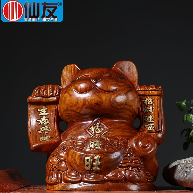 木雕招财猫摆件花梨木动物木制z工艺品可爱摆件实木雕刻装饰工艺