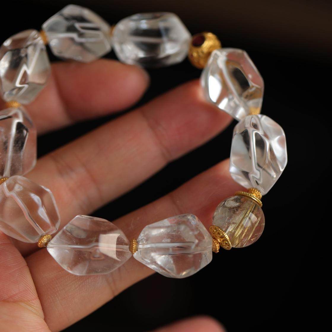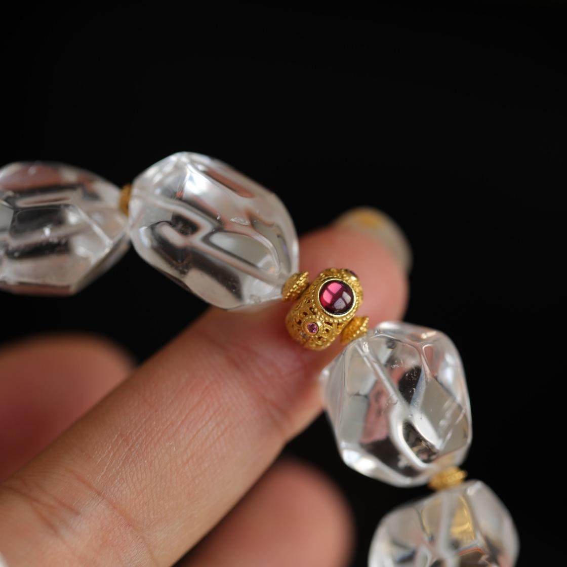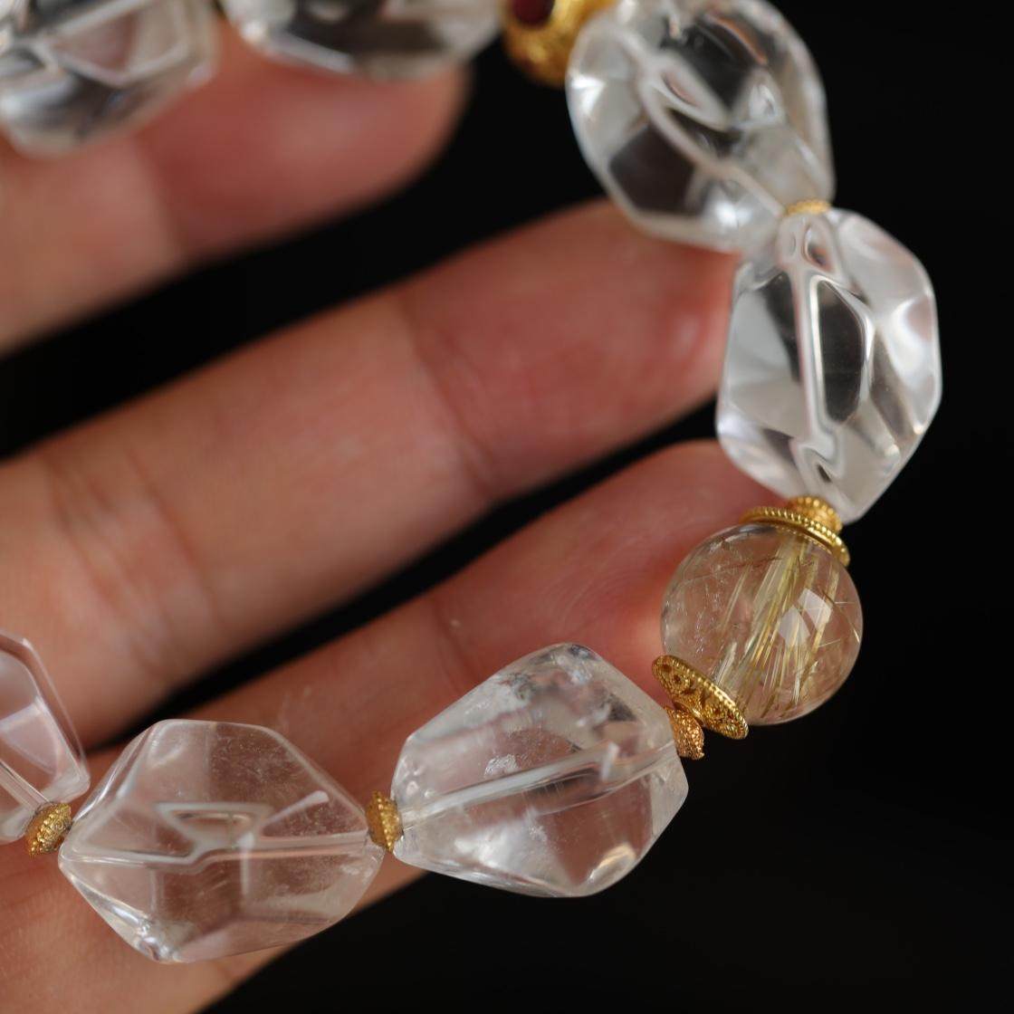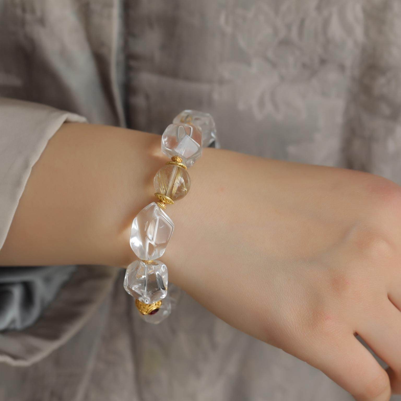 天然白水晶随形手链搭配天然金发晶配珠纯银鎏金镶嵌紫牙乌石榴石