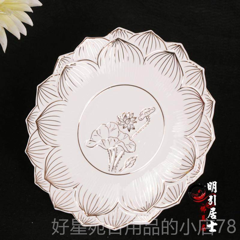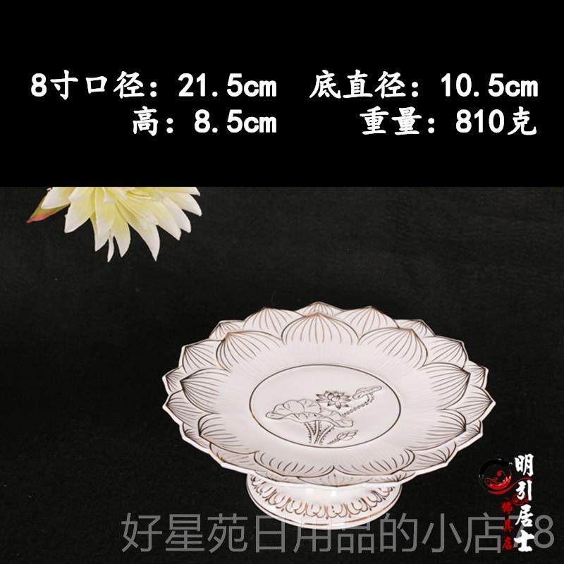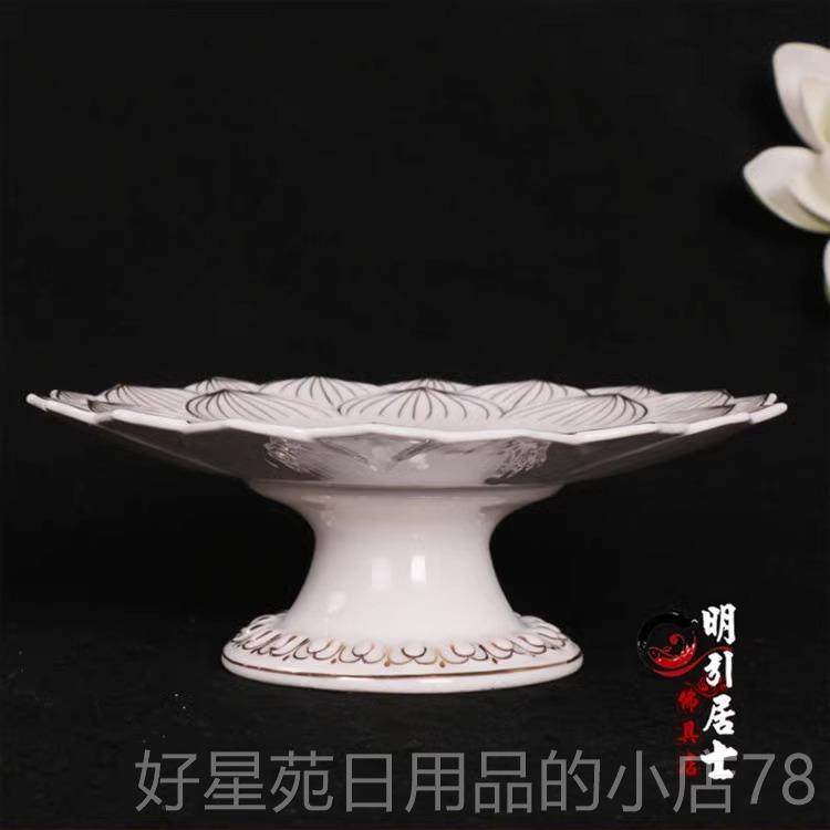 高档明佛堂用品 引白色无字描果金莲花高脚果碟供陶瓷佛具家用盘