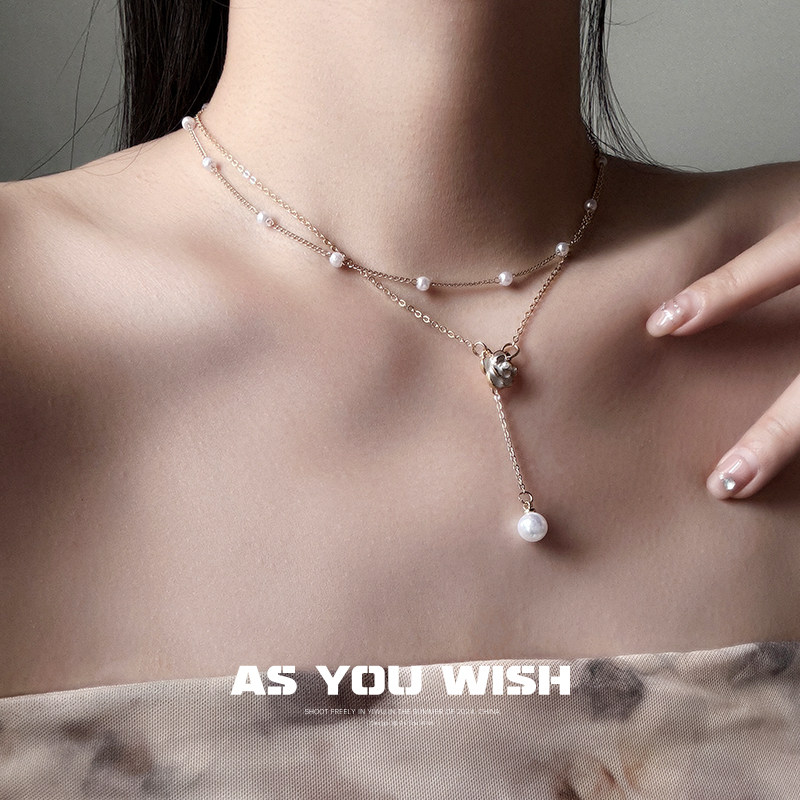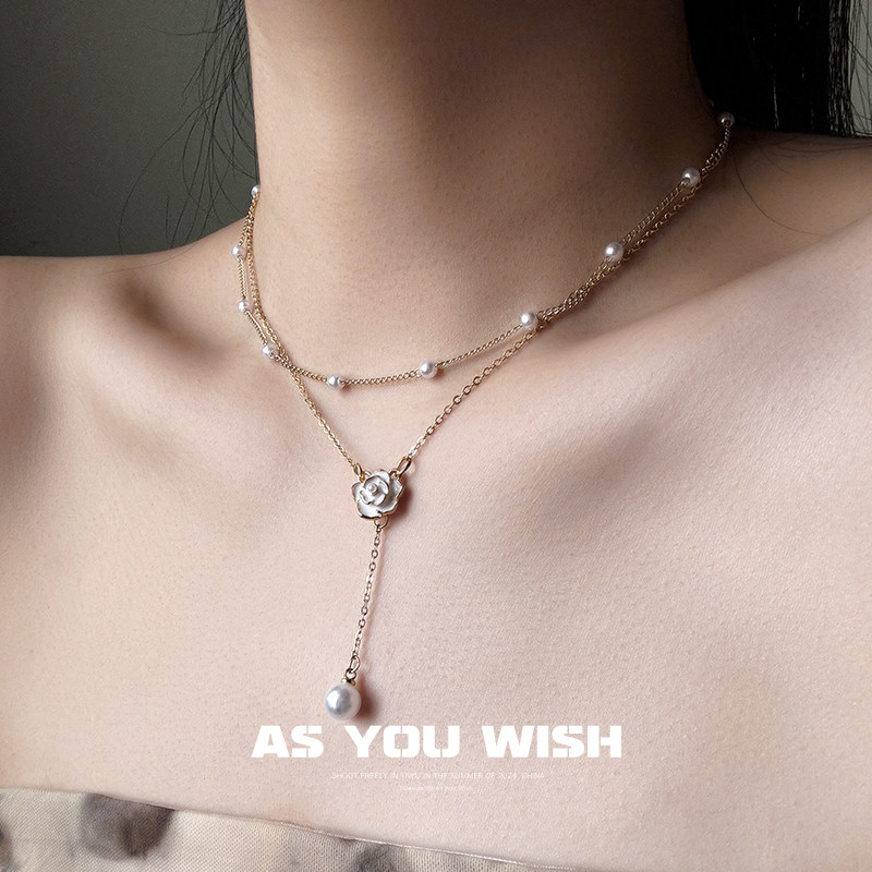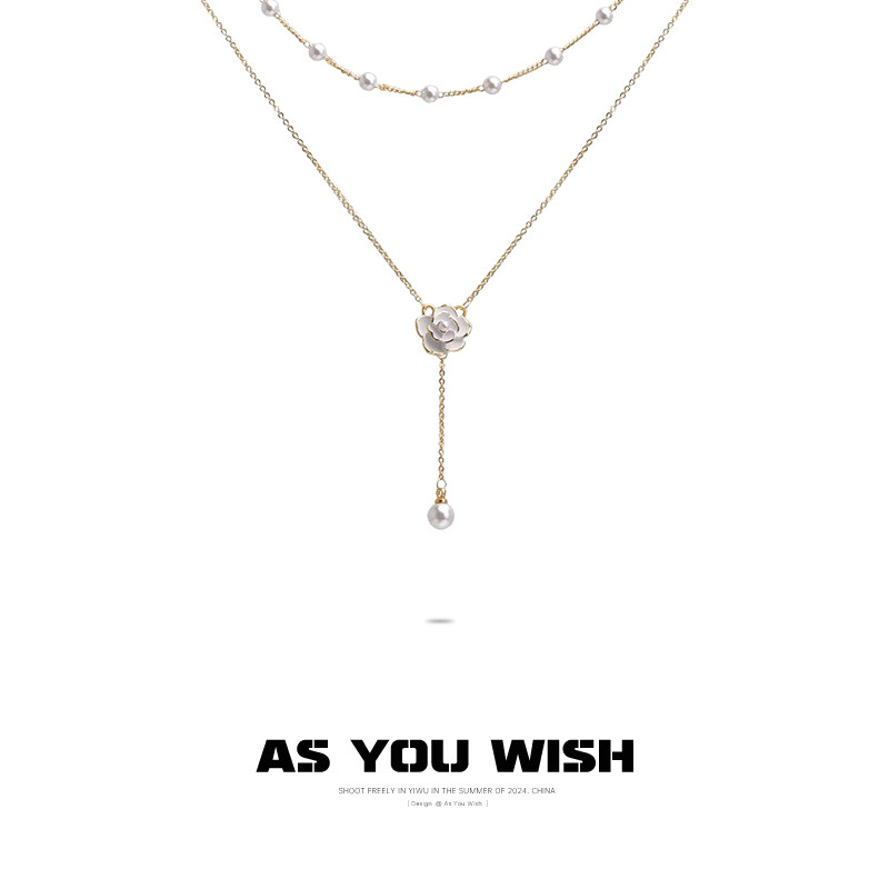 ASYOUWISH 双层珍珠山茶花流苏项链时尚百搭秋冬高级感颈链锁骨链