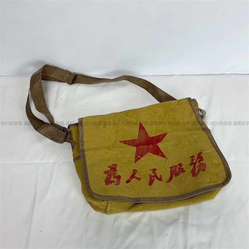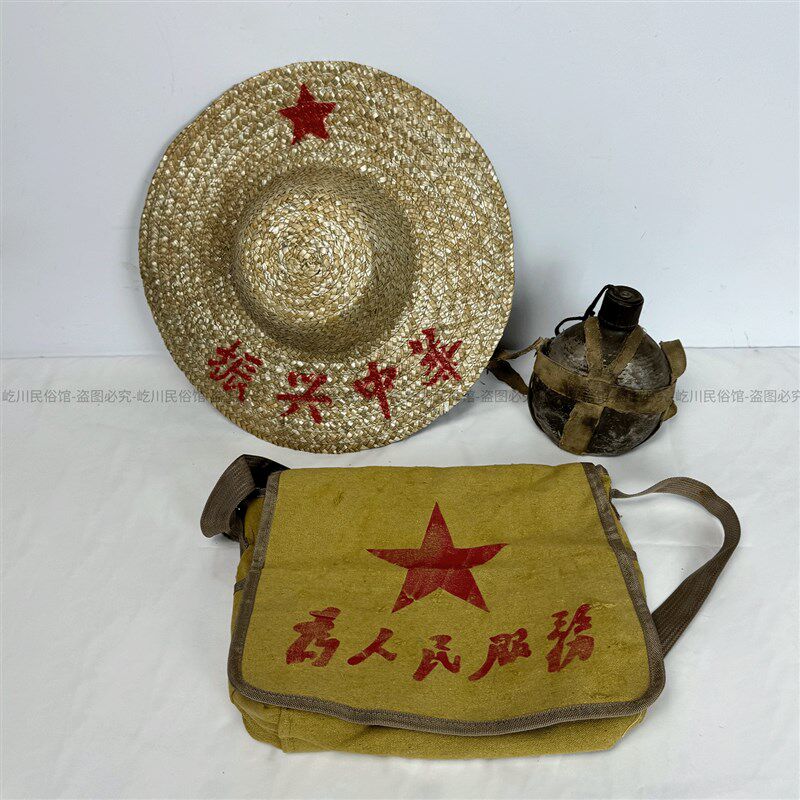 红色收藏老物件老旧草帽农村竹编曹帽为人民服务挎包农家摆件装饰