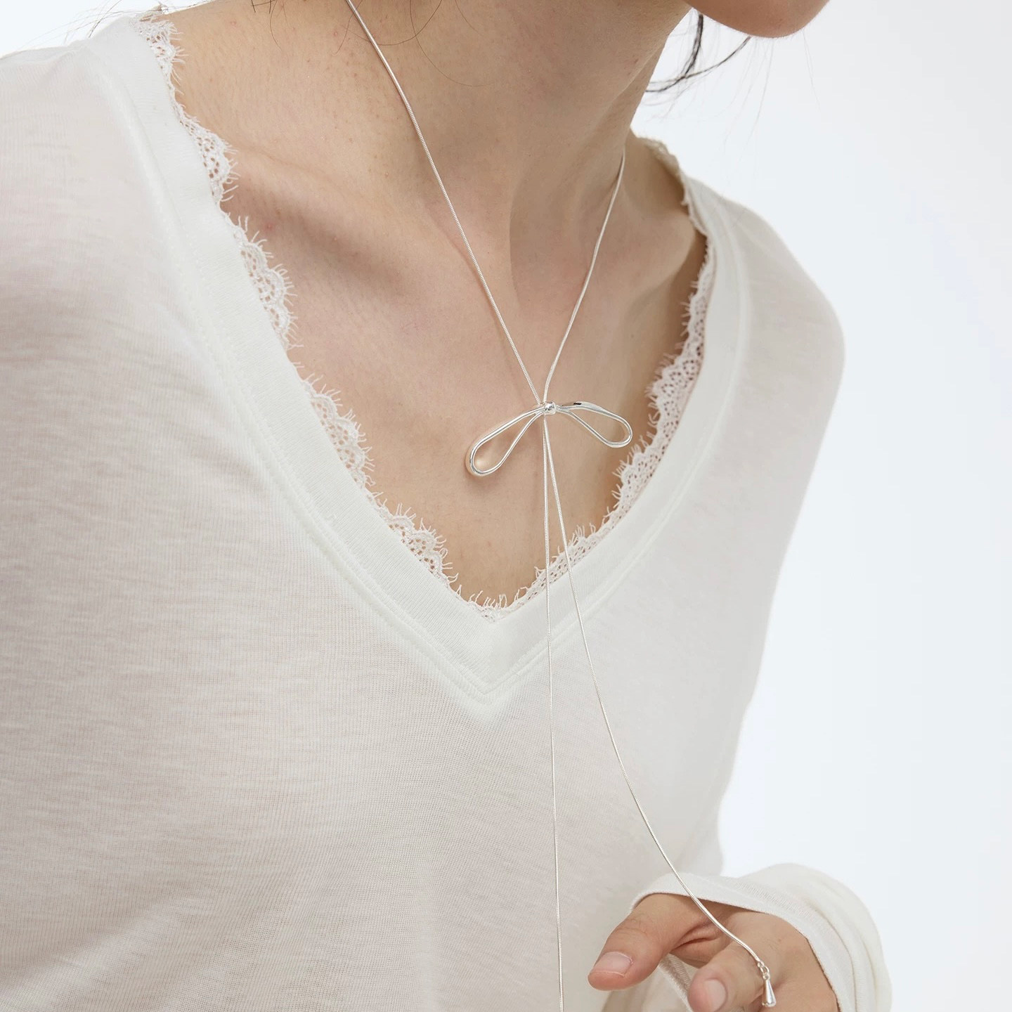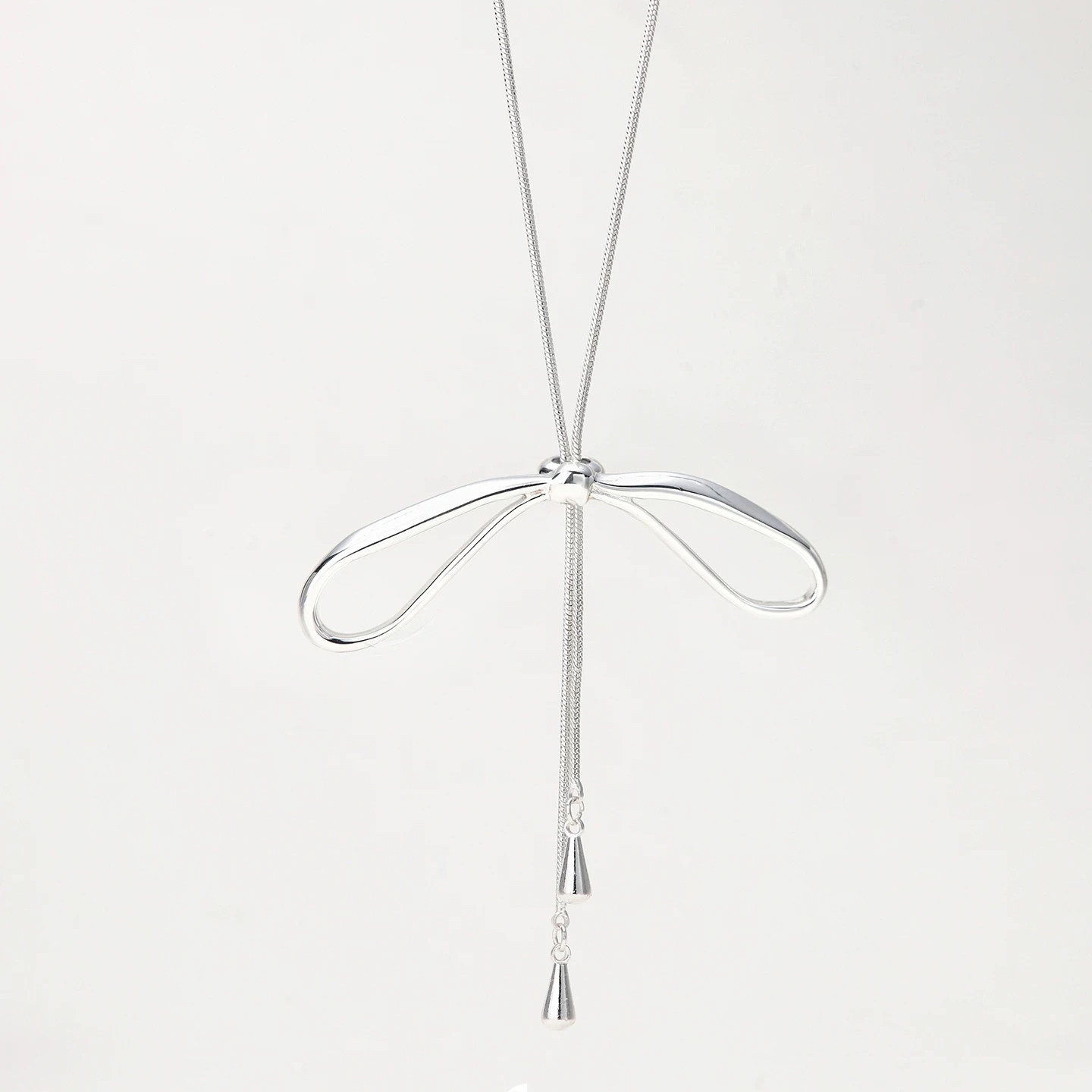 银色蝴蝶结抽拉项链女小众设计高级感气质长款毛衣链可调节锁骨链