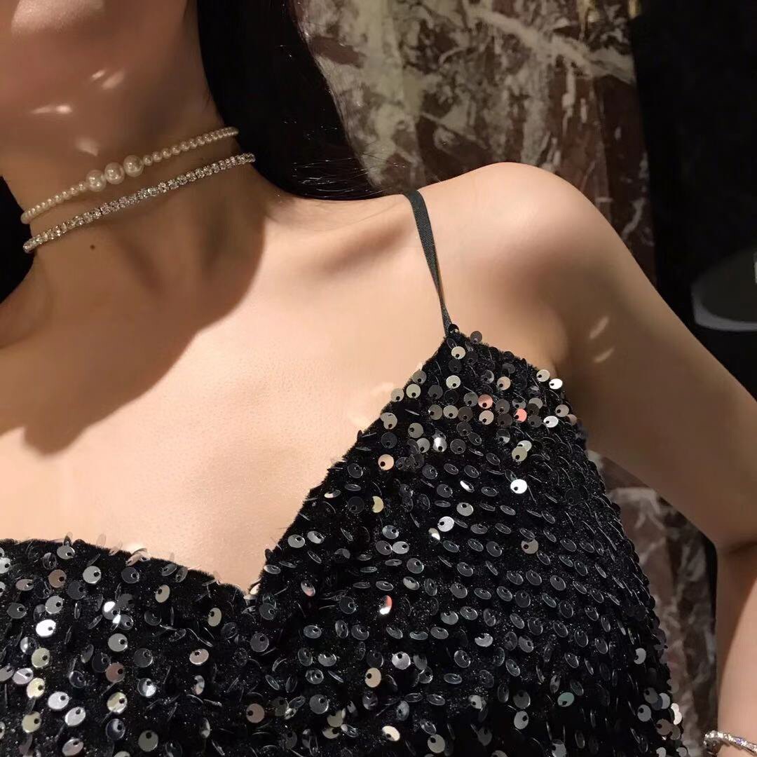 ins简约单排水钻项圈短款爆闪性感女神项链choker弹性配饰冷淡风