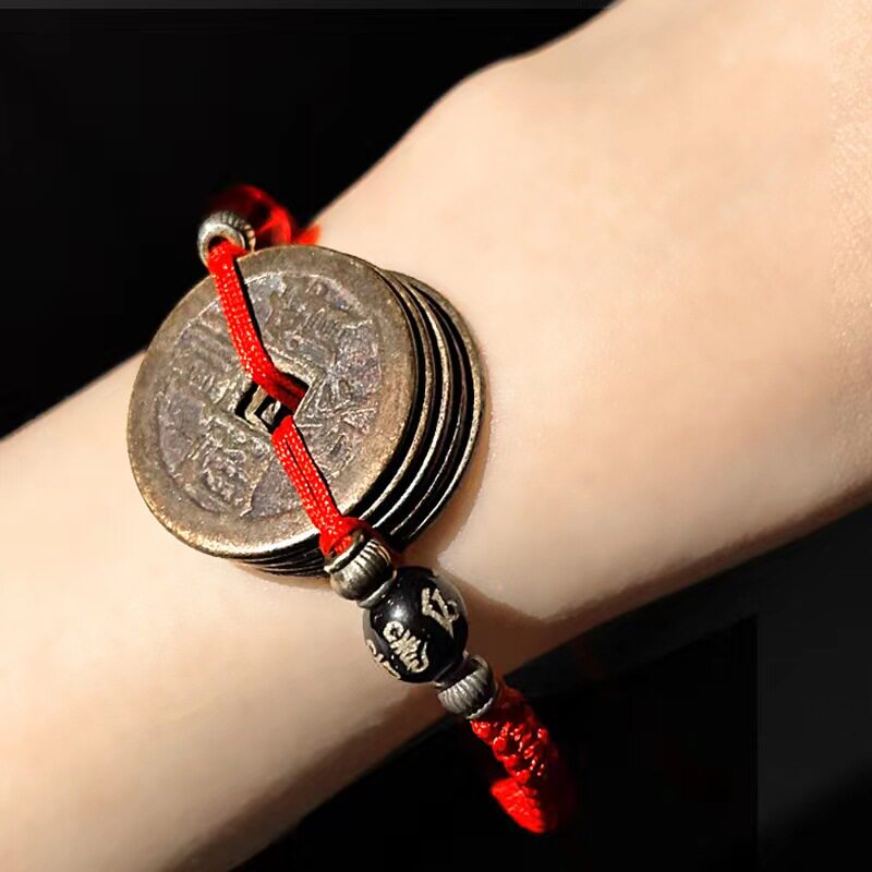 真品五帝钱手錬红色咖啡色可选手工E编织绳老铜钱门对门压门槛古