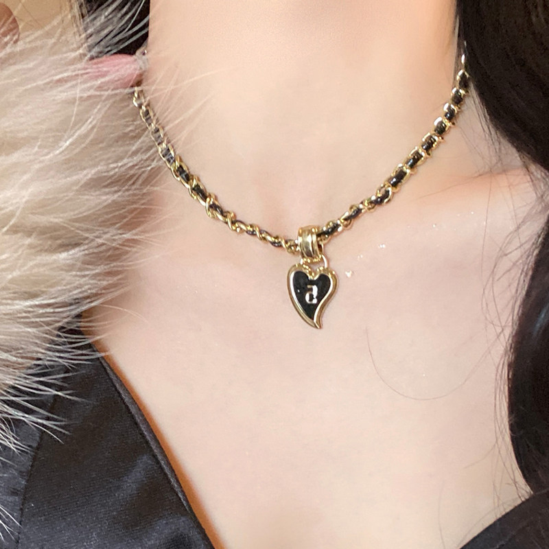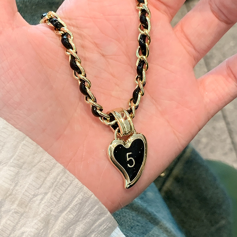 黑色爱心项链轻奢小众皮革锁骨链小香风项链女款毛衣链吊坠首饰品