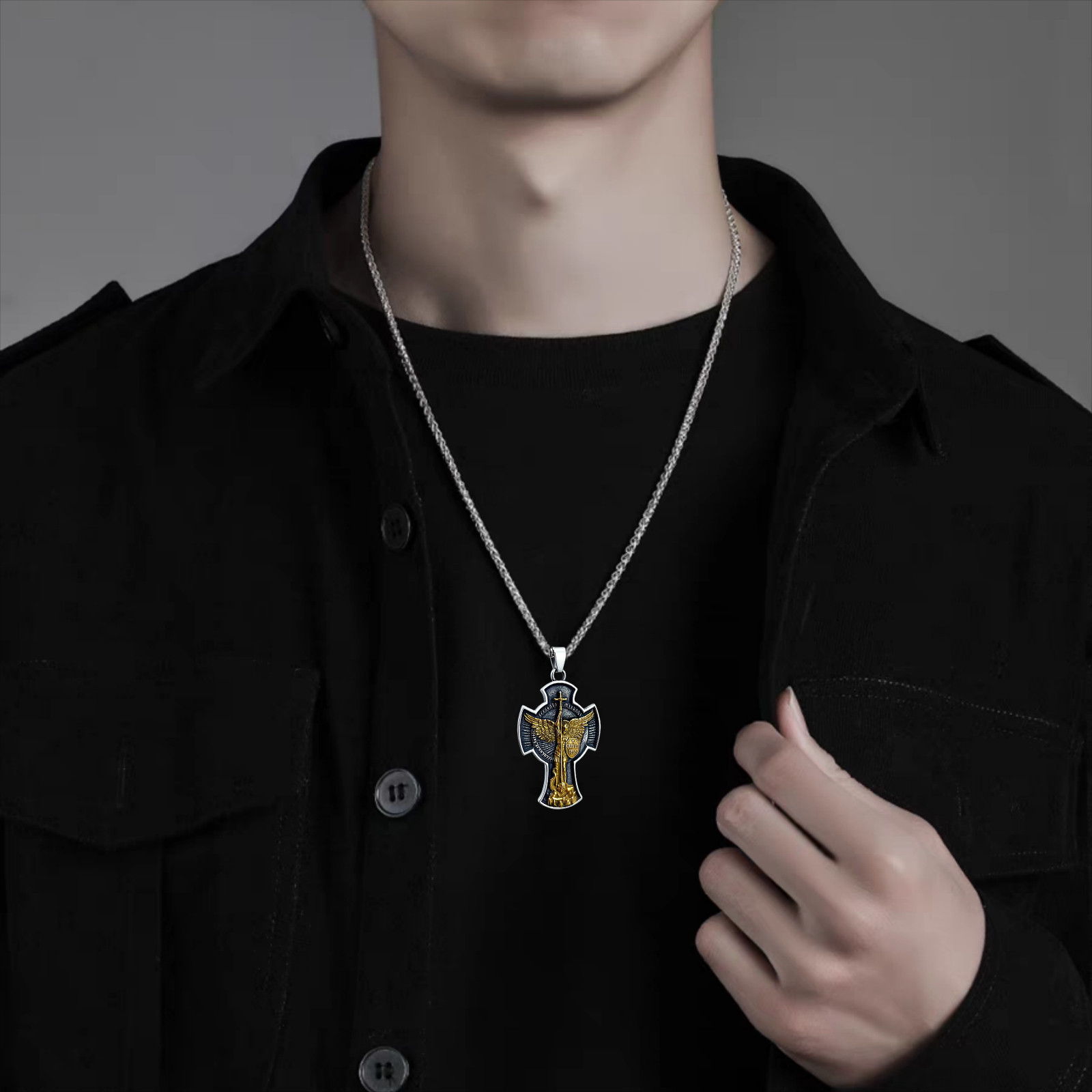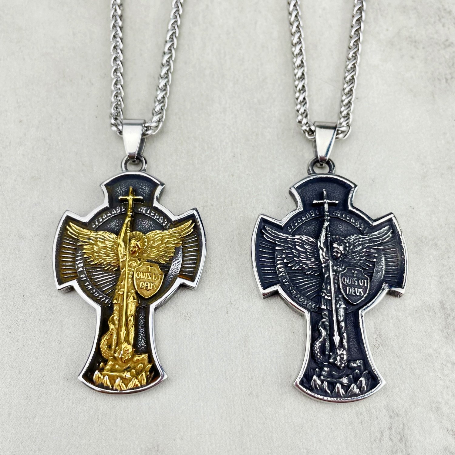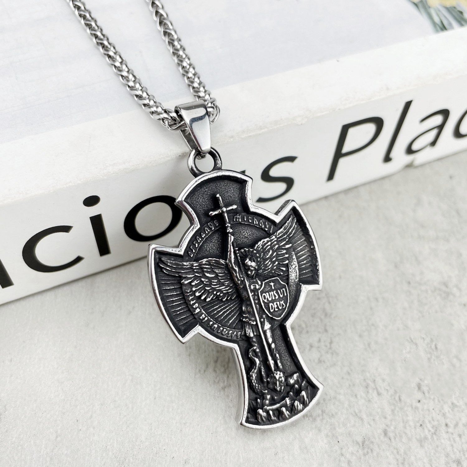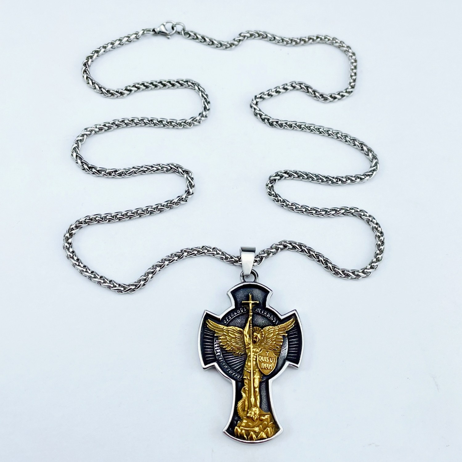 欧美风大天使圣米迦勒十字架盾牌项链男个性钛钢复古吊坠嘻哈朋克