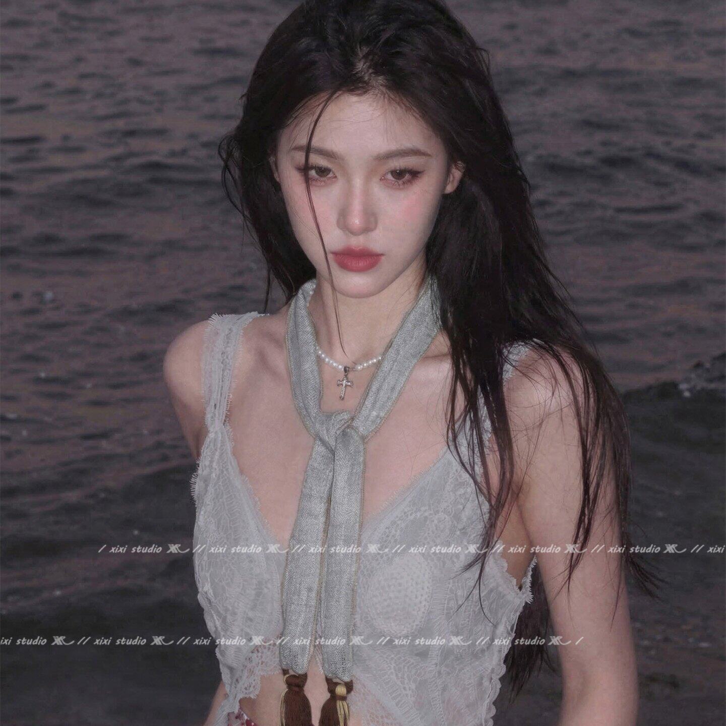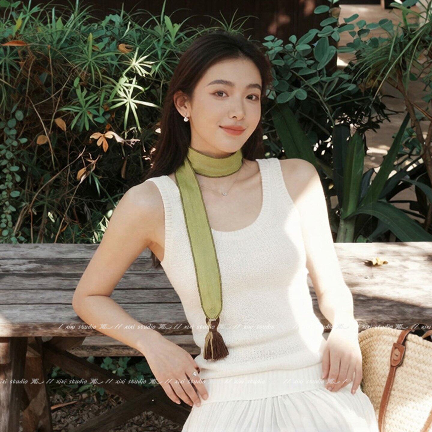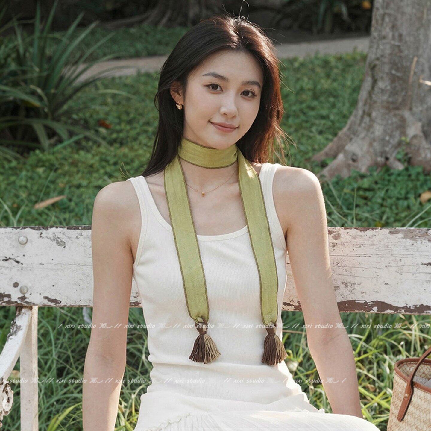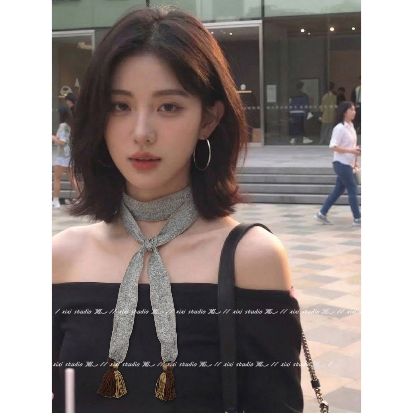 日系灰色亚麻流苏丝巾项链小众设计长条颈饰个性百搭颈带配饰新品