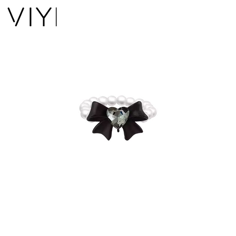 黑色爱心蝴蝶结珍珠款戒指女小众设计食指戒轻奢高级指环复古手饰