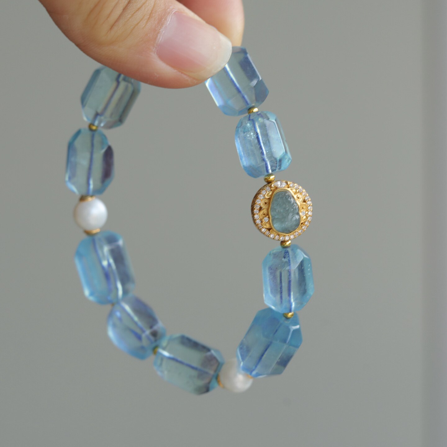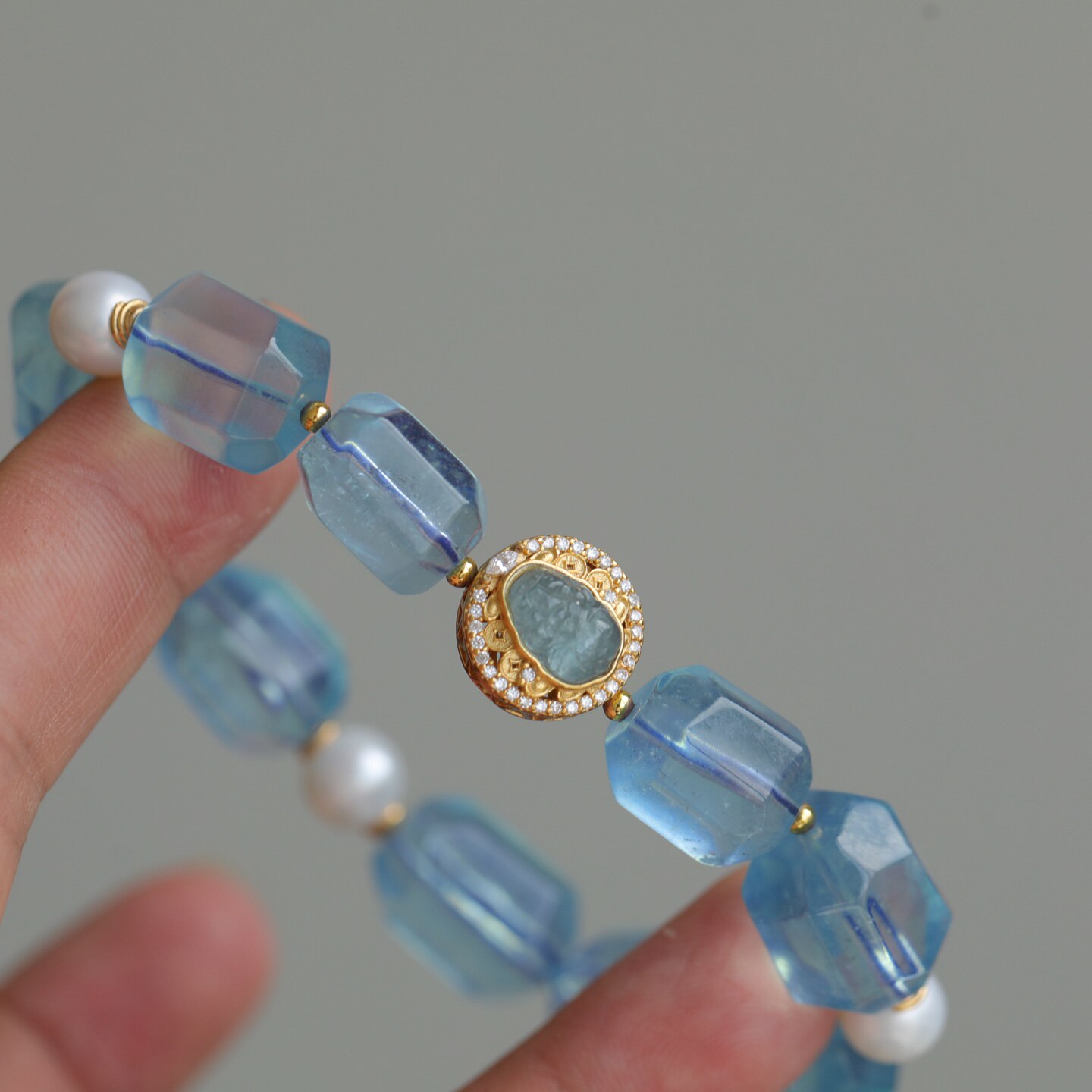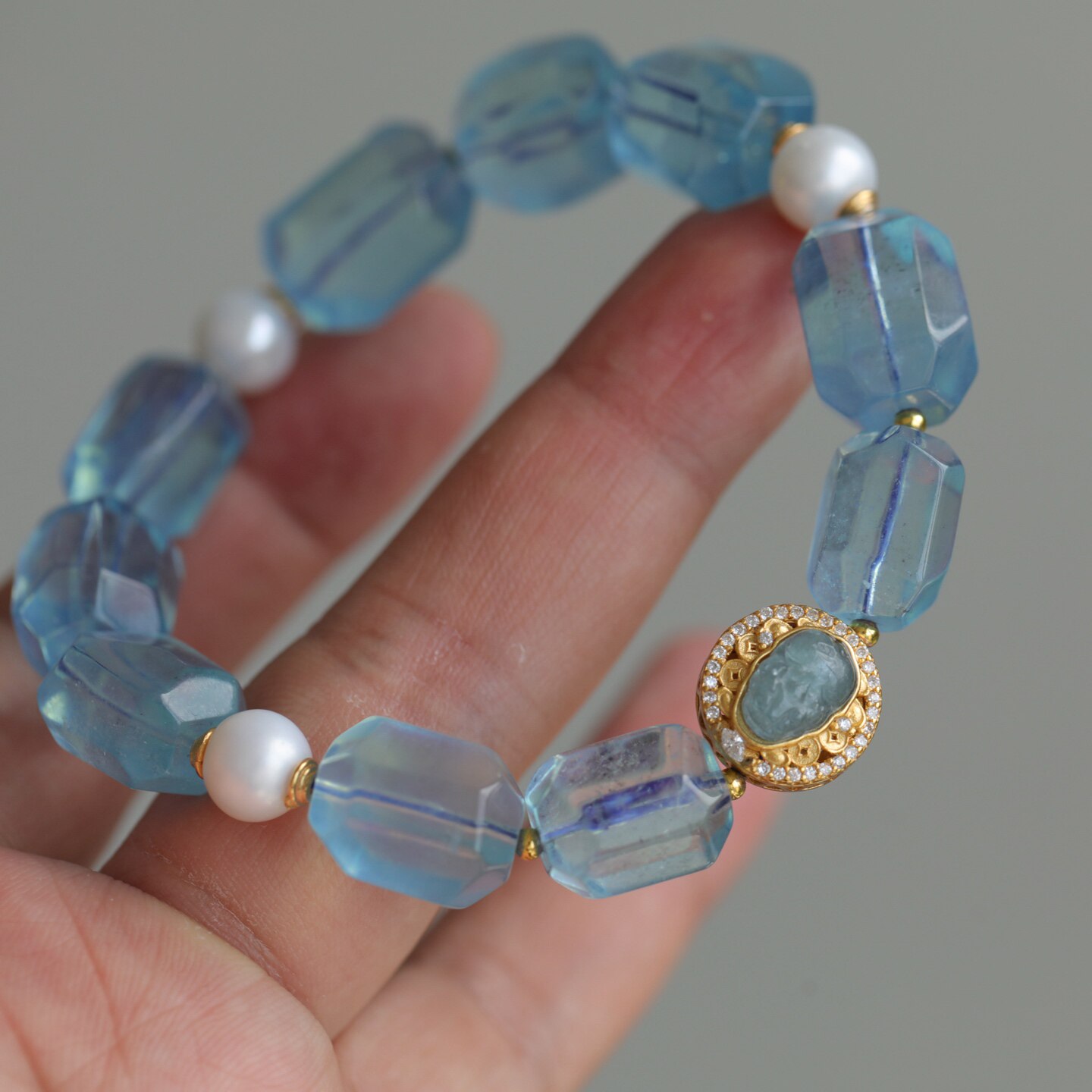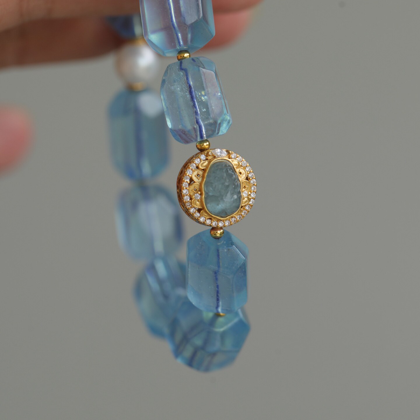 高端定制天然海蓝宝磨面随形手链纯银鎏金镶嵌蓝色碧玺精雕貔貅64