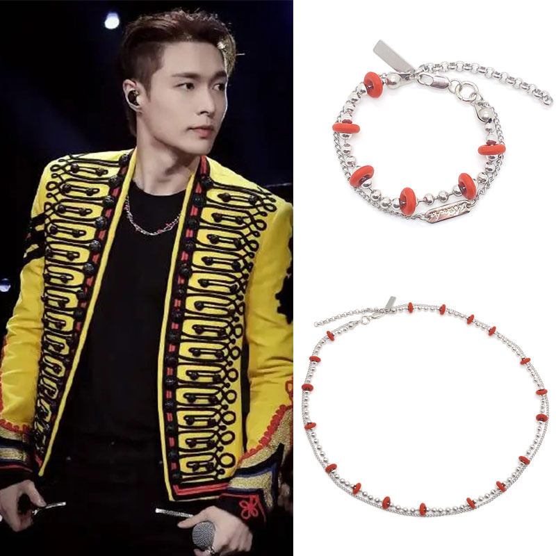 张艺兴LAY同款红色胶圈钛钢双层项链手链圈环青春休闲流行潮饰品Z