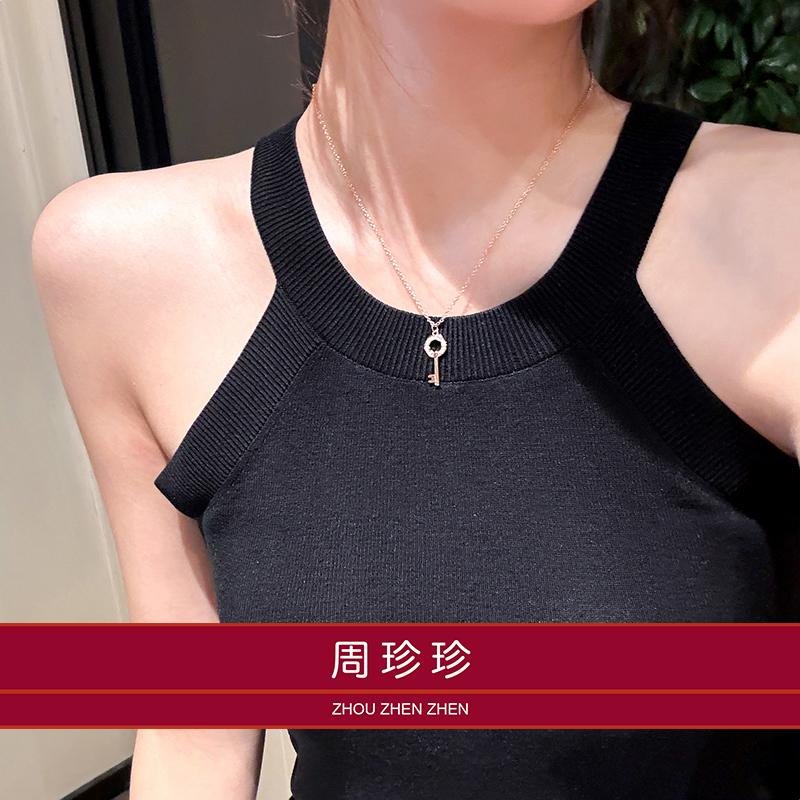 周珍珍18K玫瑰金镶钻圆形镂空钥匙项链轻奢小众设计感锁骨链女生