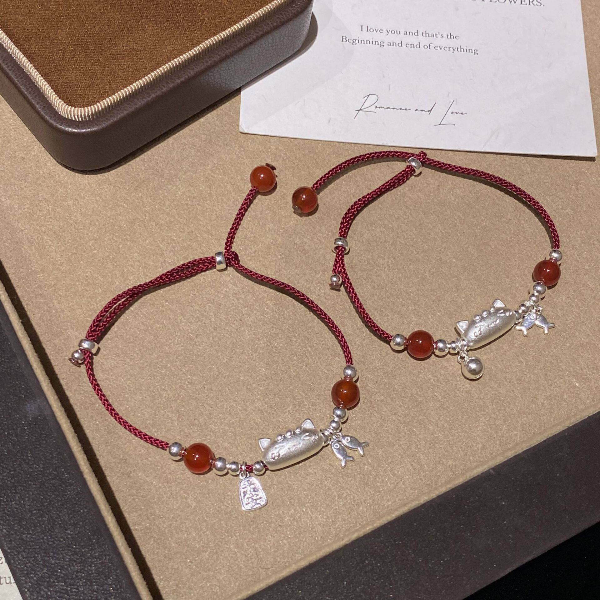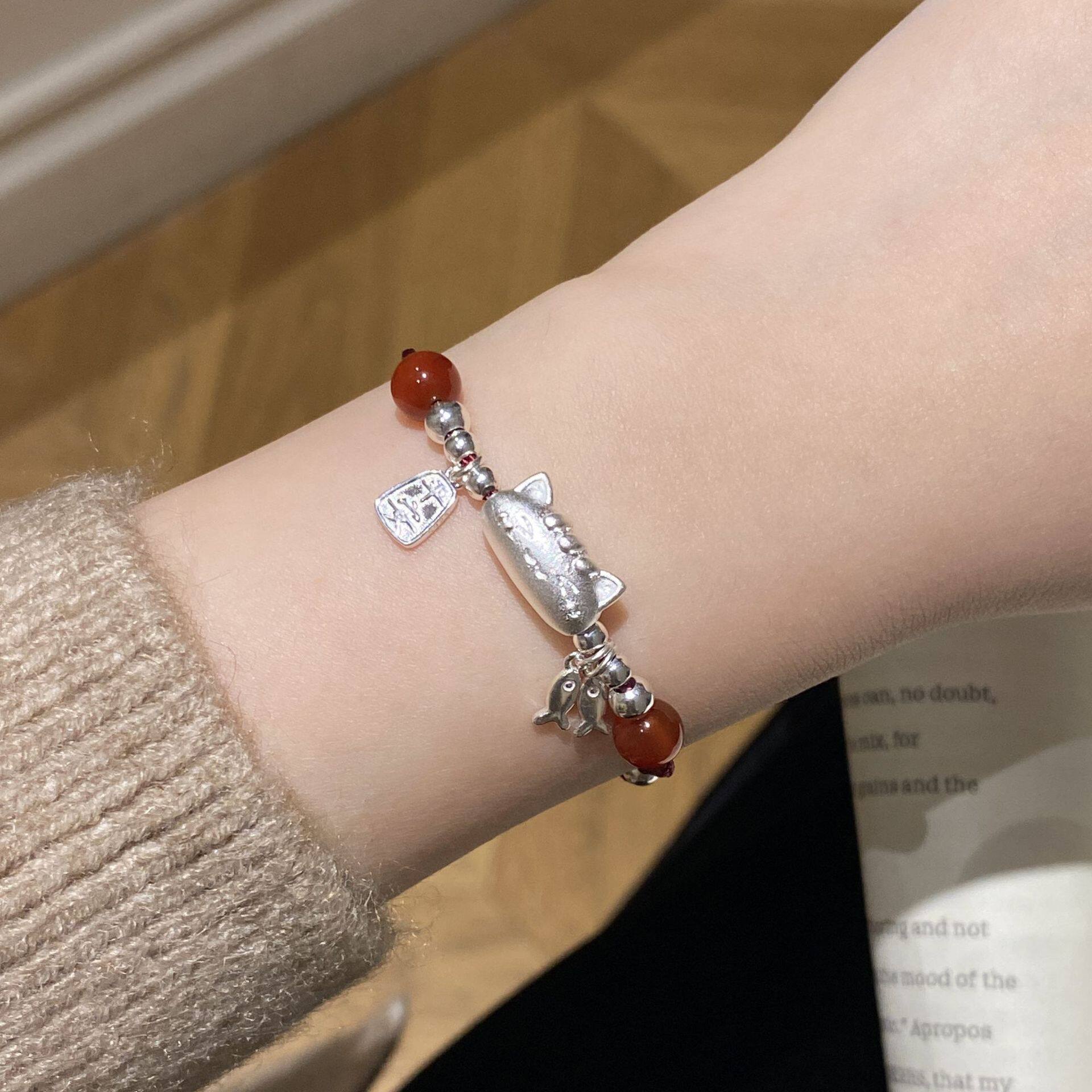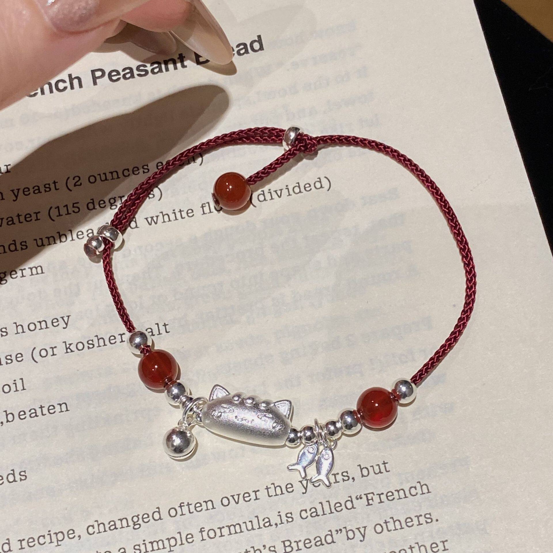 S925纯银可爱法棍猫咪红绳手链女显白红玛瑙平安喜乐编织手饰
