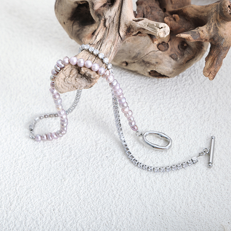 紫色天然淡水珍珠锆石OT扣拼接链项链女钛钢百搭西太后锁骨链饰品