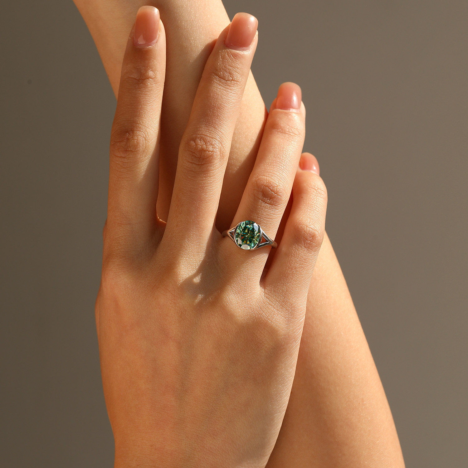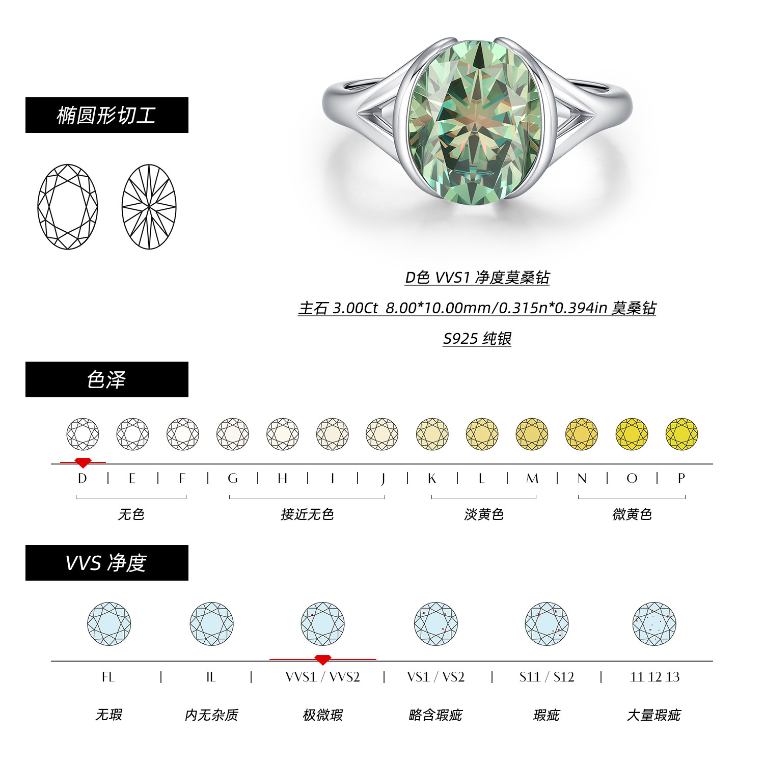 MODIAN摩典3克拉彩色莫桑钻戒指女S925纯银轻奢感赫本风蛋面钻戒