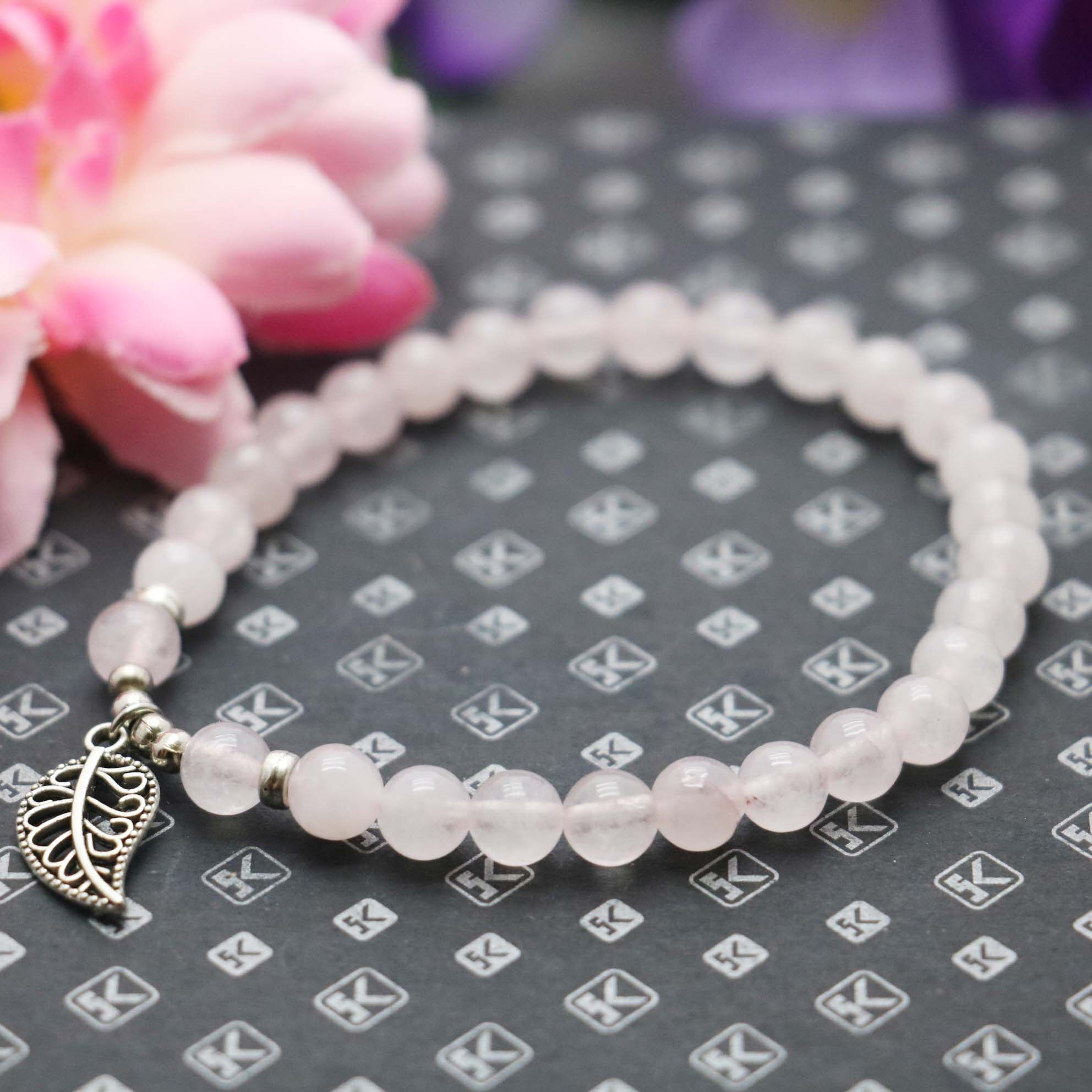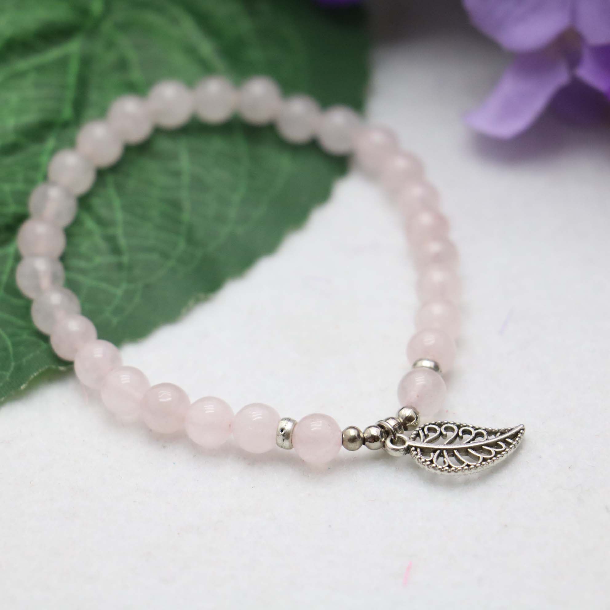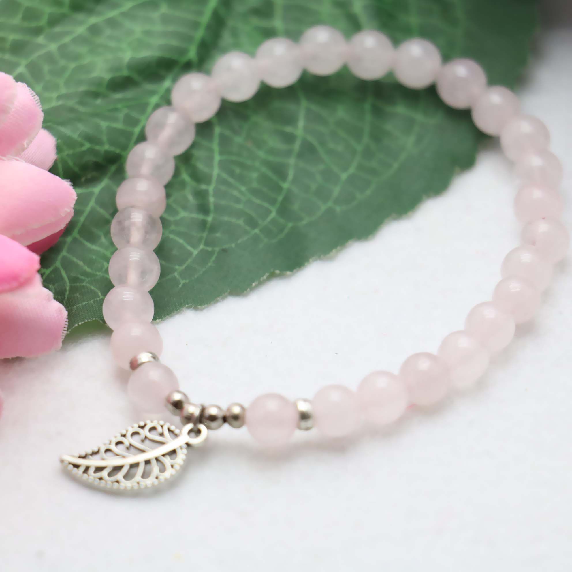 当前位置:首页>商品详情>6mm圆珠粉水晶玉髓手链 配小叶子吊坠手串特色玉石小饰品女友礼物