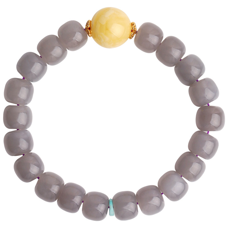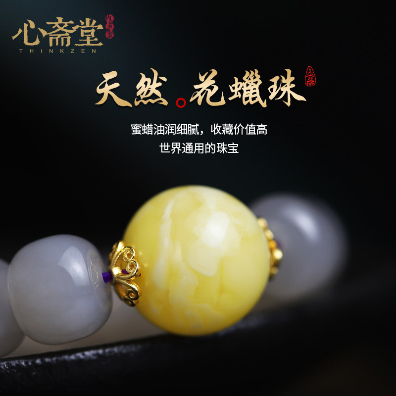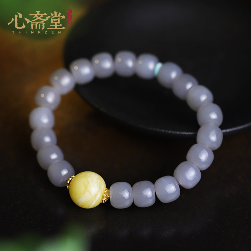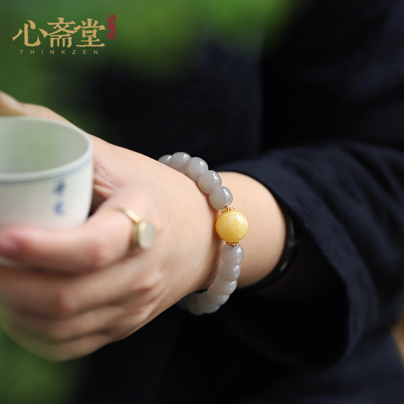 心斋堂天然保真高端烟紫色和田玉手链女夏玉石手串白花蜜蜜蜡饰品