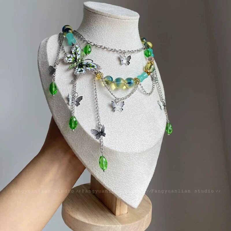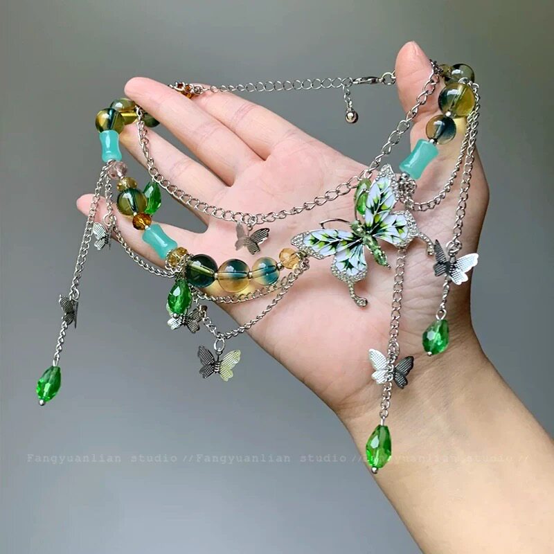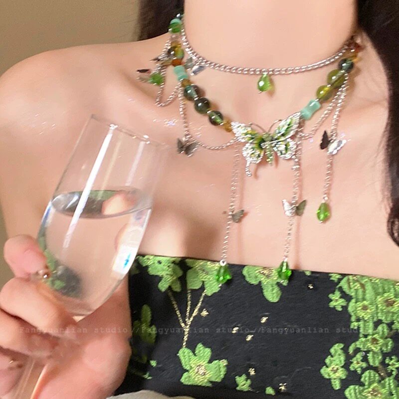 春夏季绿色冰晶蝴蝶流苏项链女2025新款高级小众锁骨链choker颈链