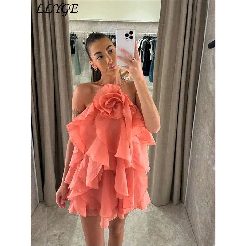 Chic Cascading Ruffles 3d Flower Short Dress Halter