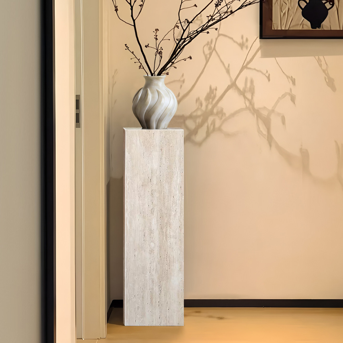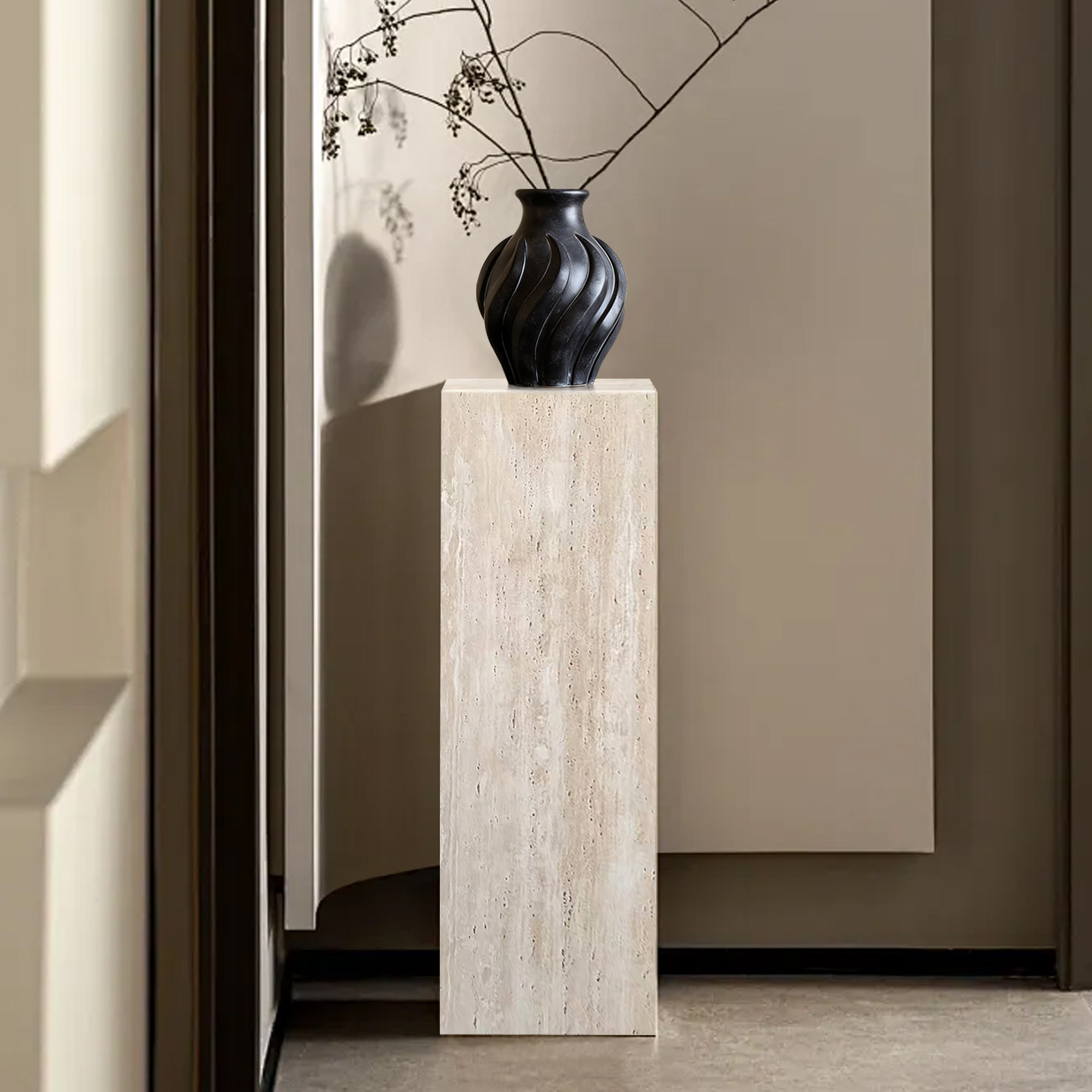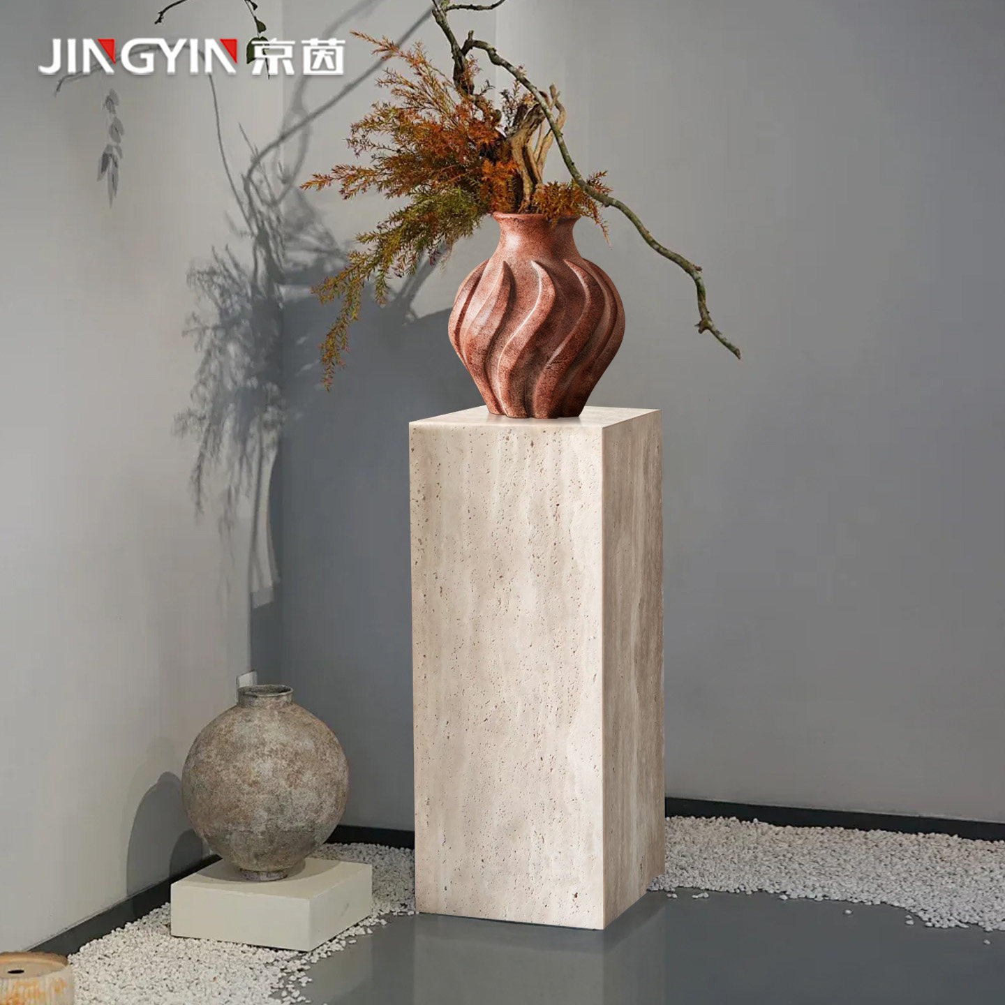 天然洞石侘寂风落地底座酒店灰色民宿极简雕塑台玄关花架可定制