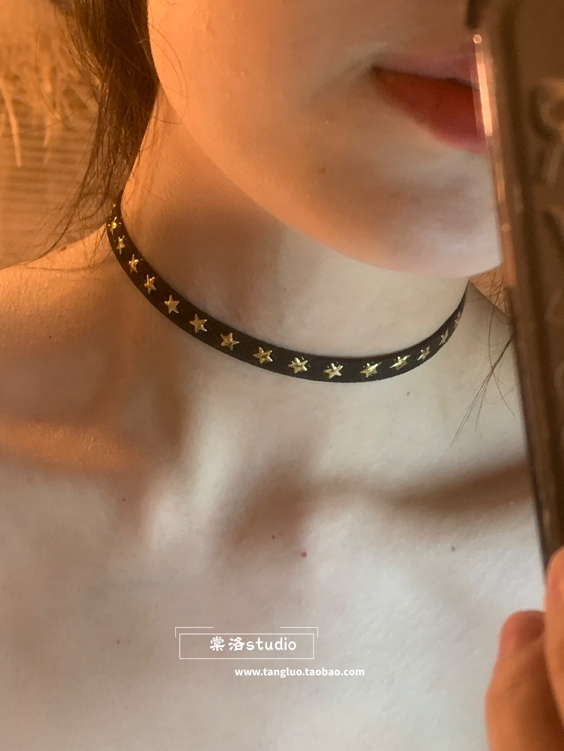 棠洛 黑色麂皮星星铆钉choker项圈女小众黑色细款颈链个性锁骨链