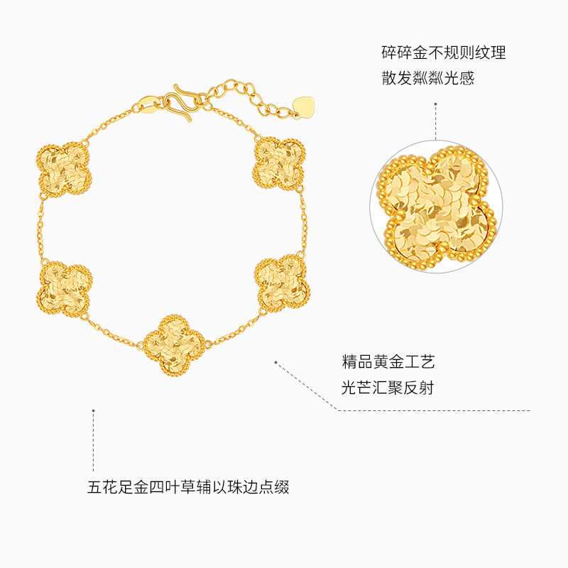 潮宏基IN+高光金四叶草五花黄金手链足金碎碎冰小版卟纪念生日
