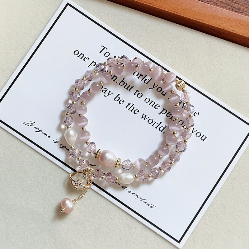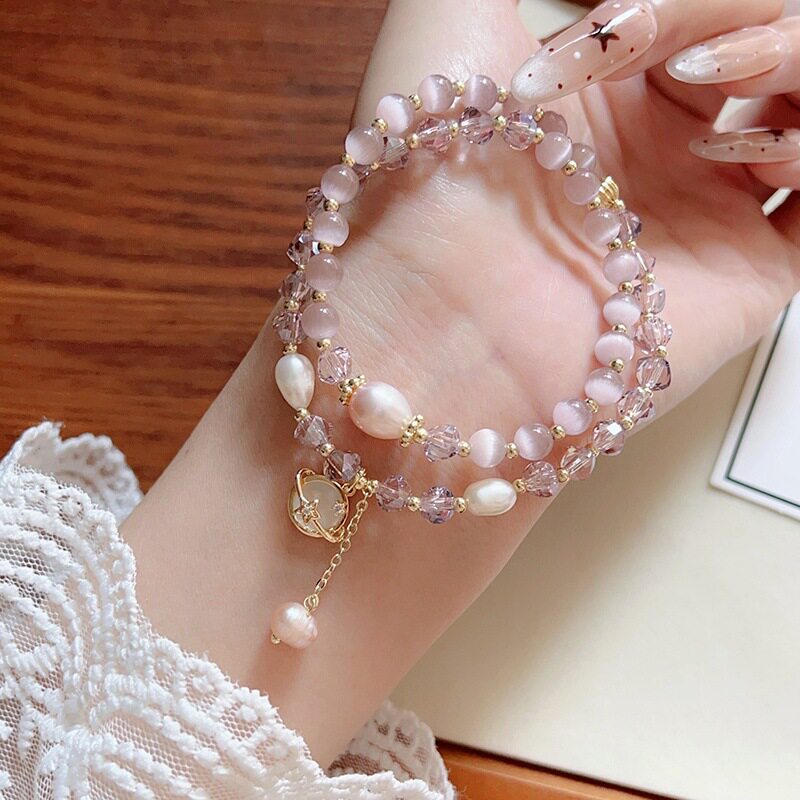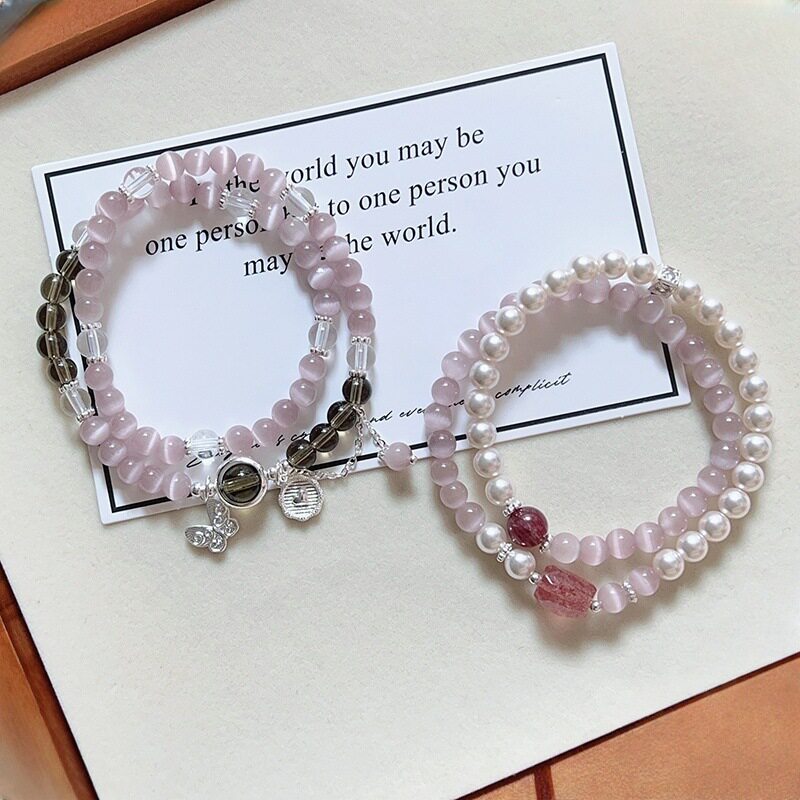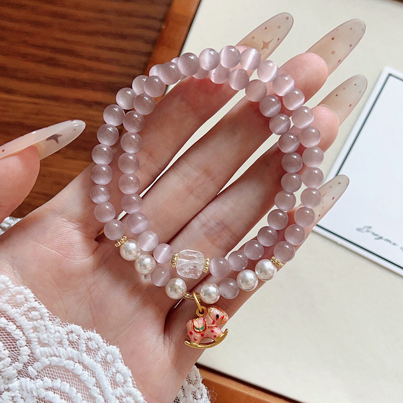 新款双圈紫色猫眼石串珠手链女ins小众高级感蝴蝶小木马手串手饰