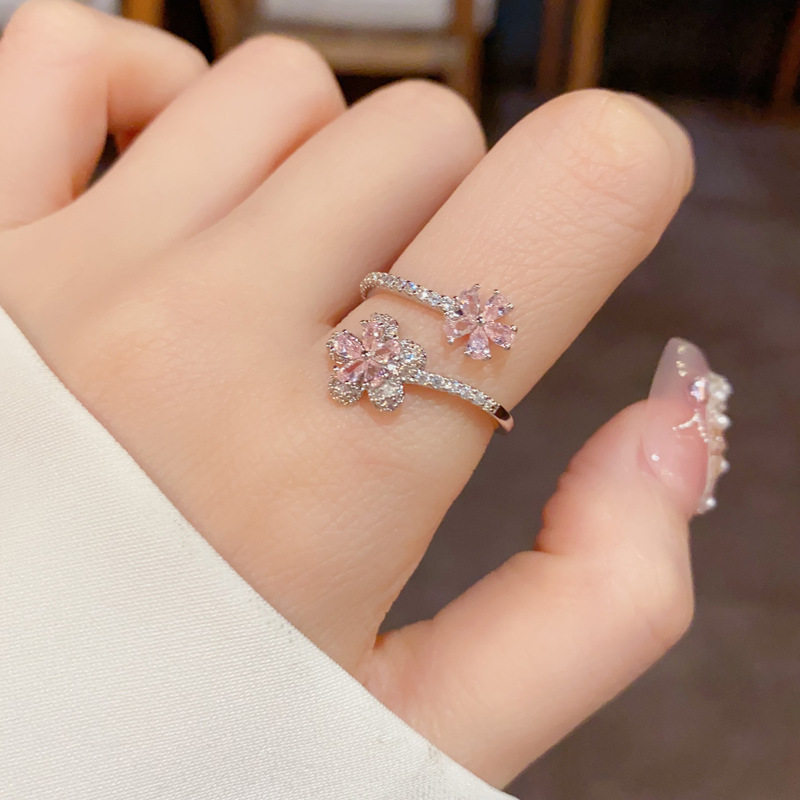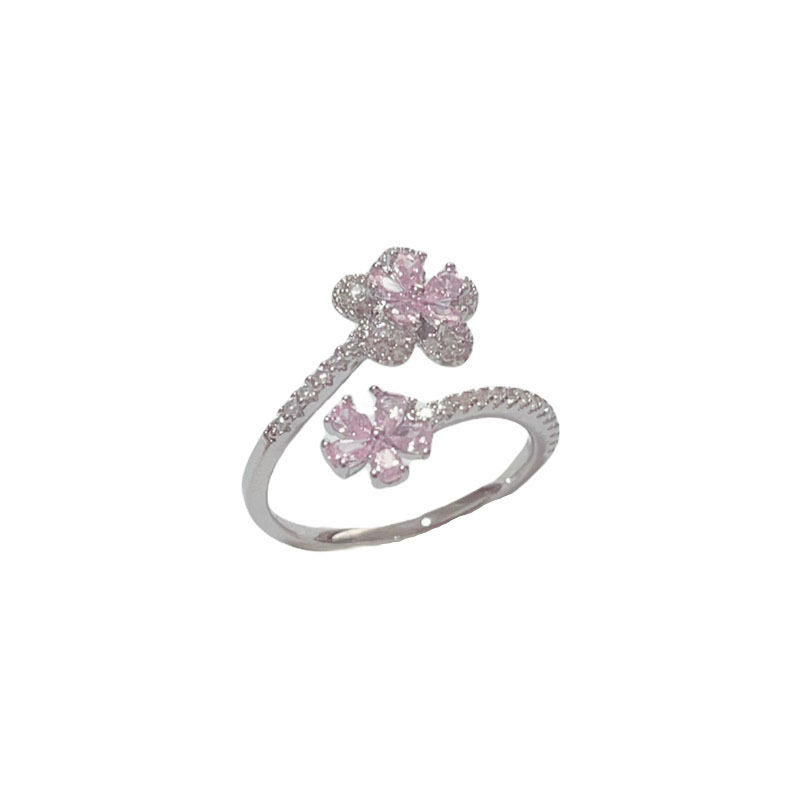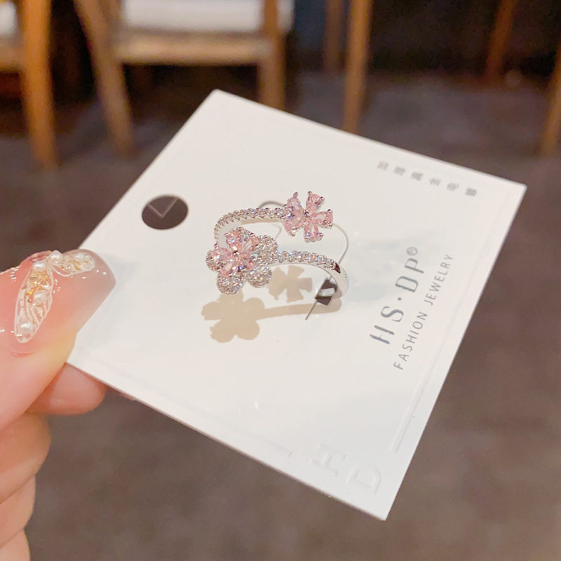 精致时尚百搭超闪粉色满钻花朵开口戒小众简约设计感饰品源头