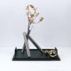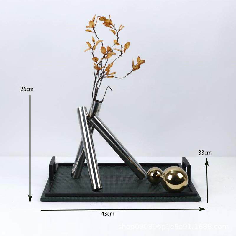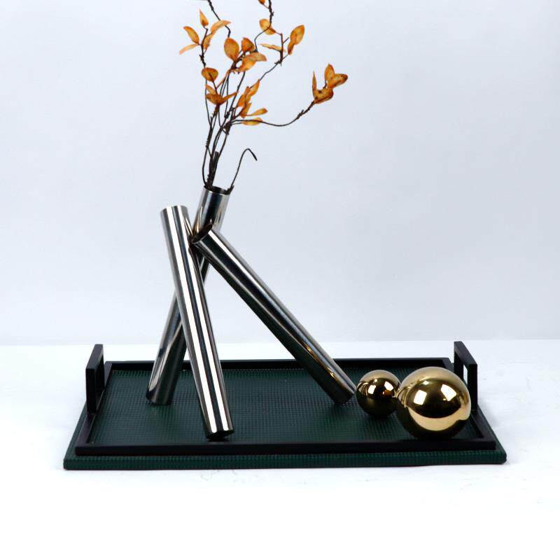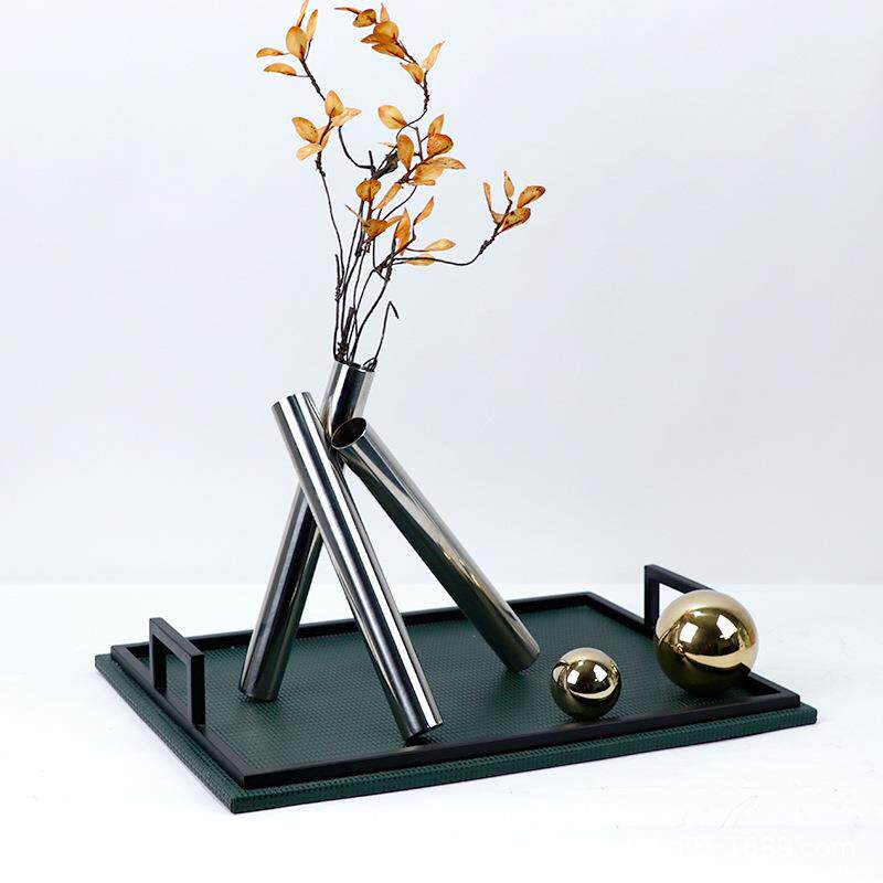 简约现代创意绿色皮革托盘三脚不锈钢花器插花套组样板间茶几摆设