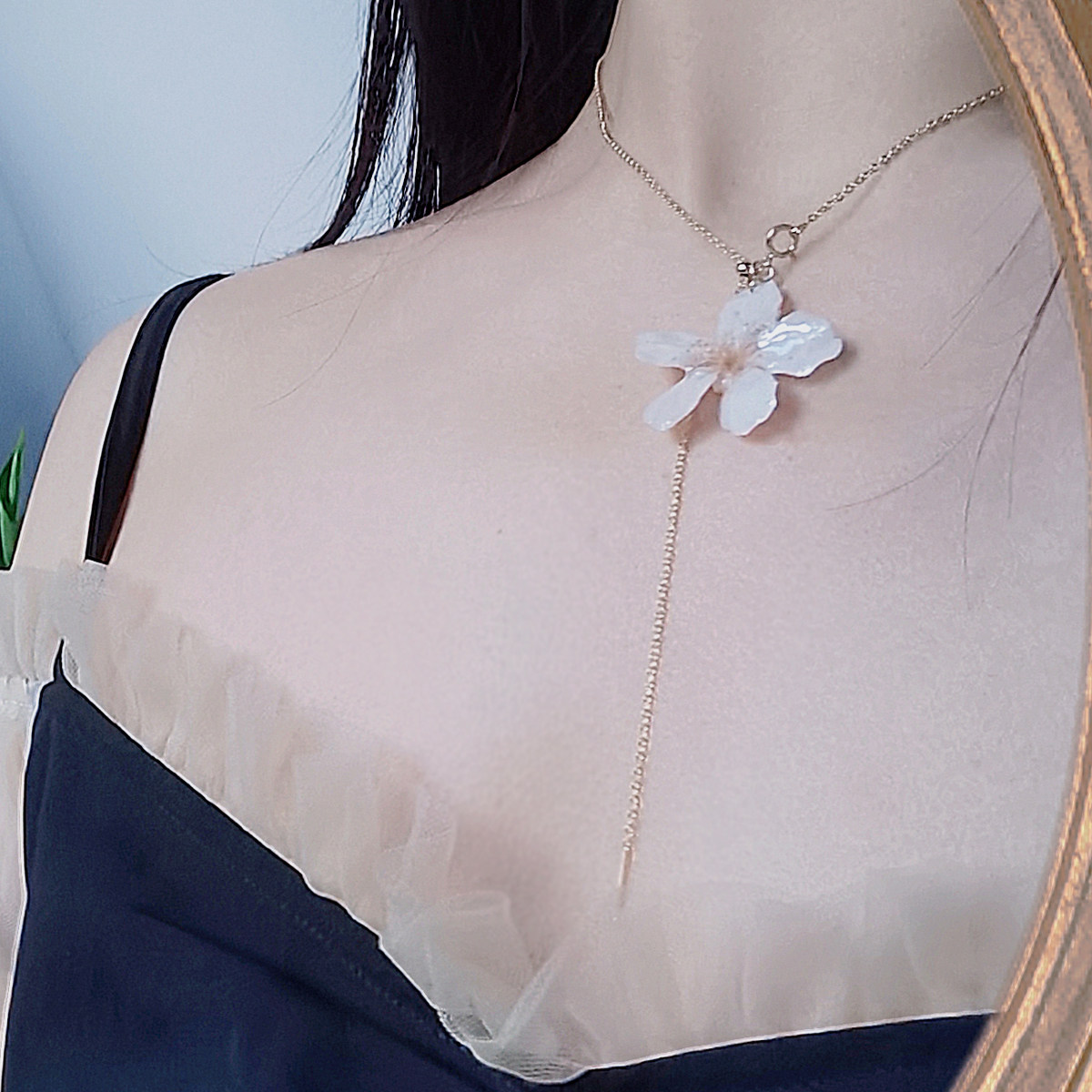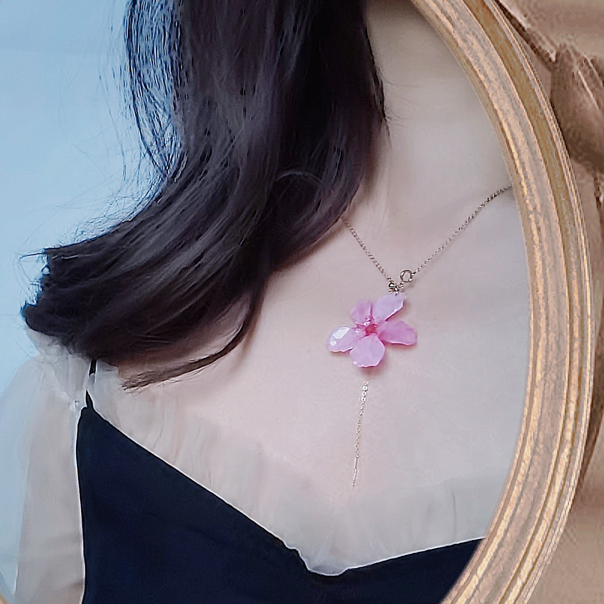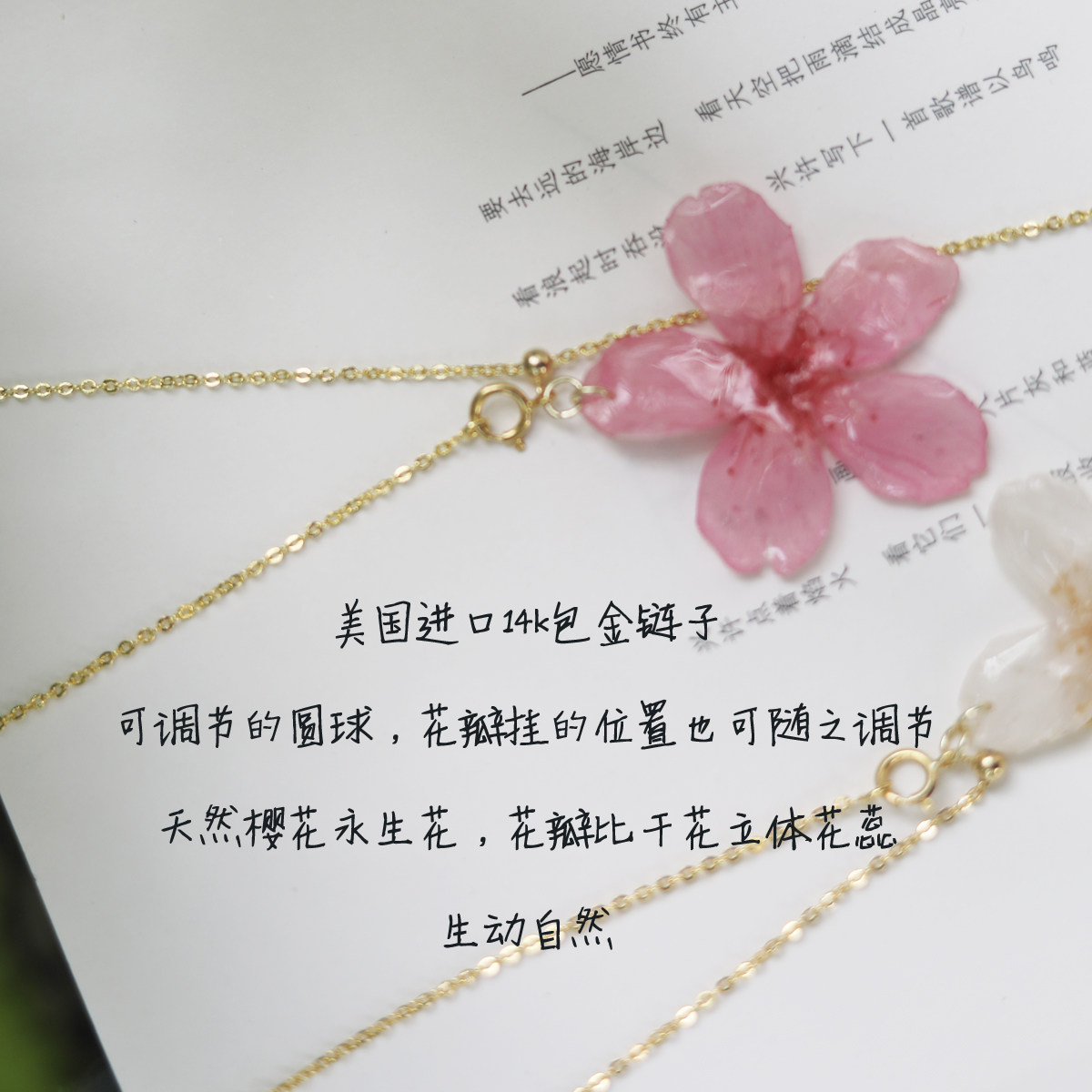 真实樱花,永生花原创手工粉色白色花朵可调节包金项链锁骨毛衣链