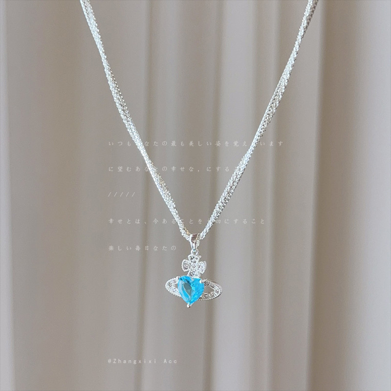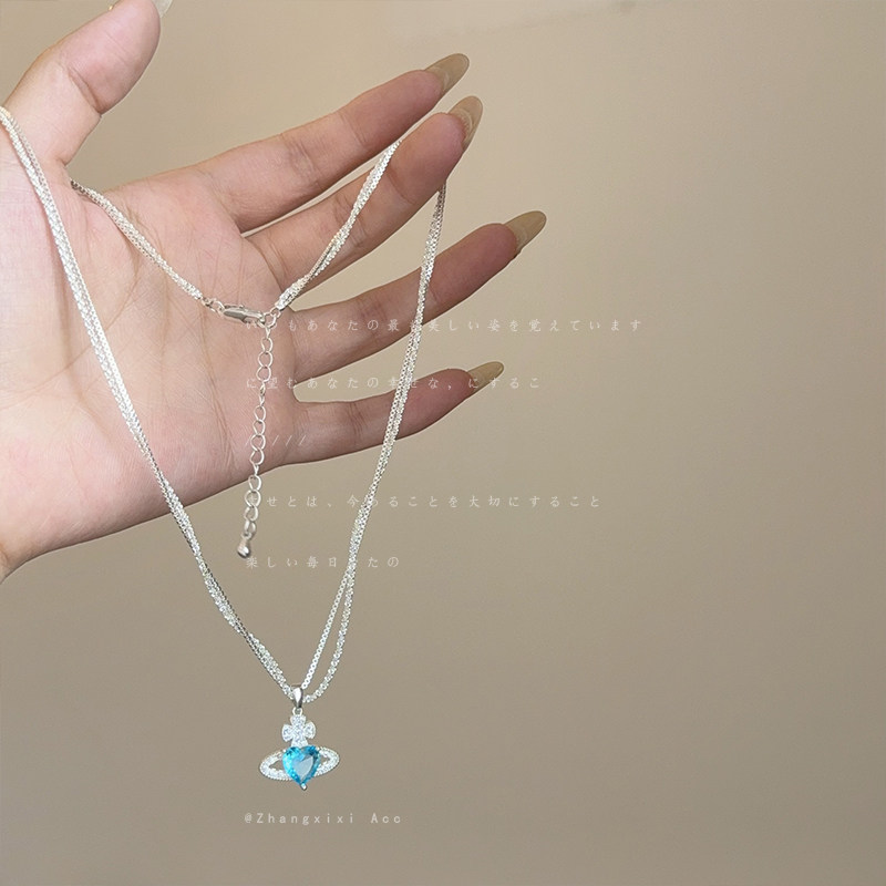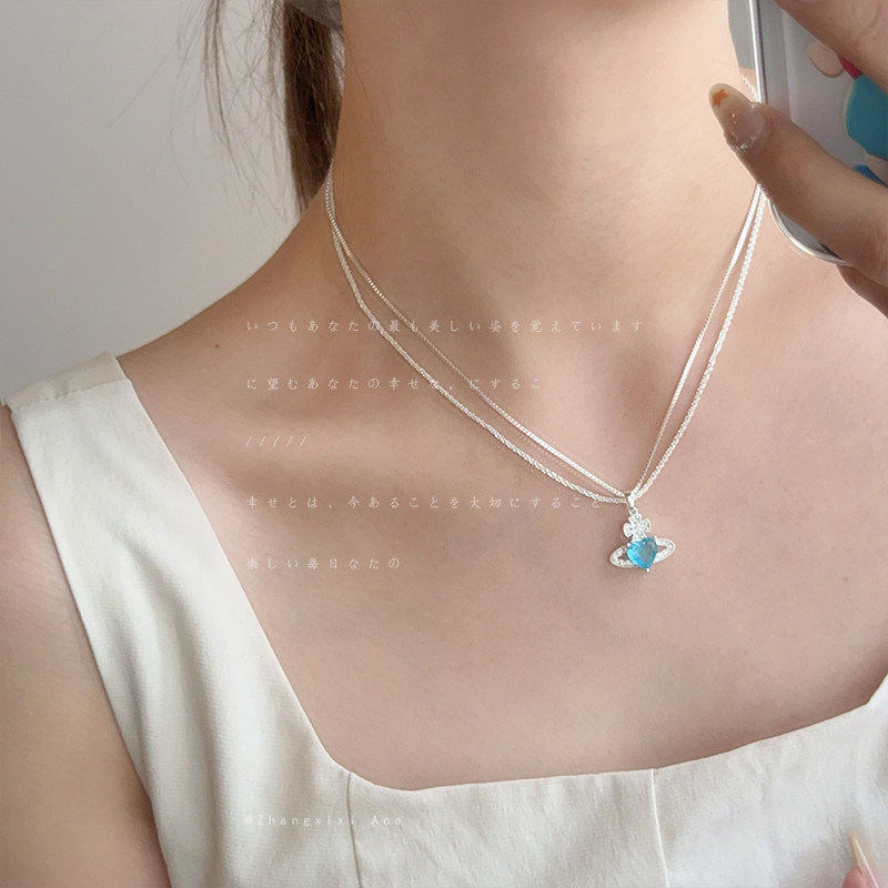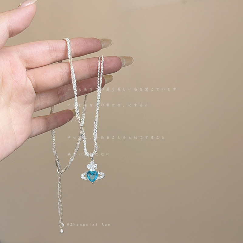 复古潮流ins蓝色爱心星球吊坠项链女小众设计感时尚锁骨链颈链