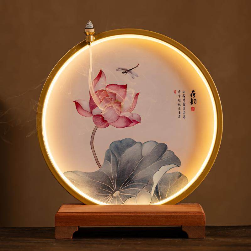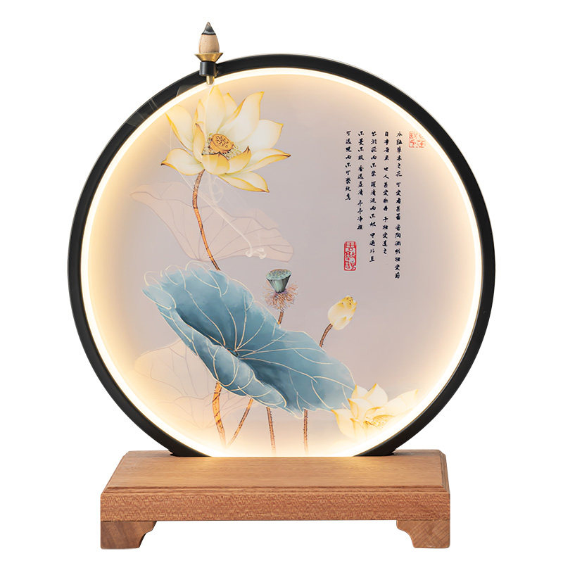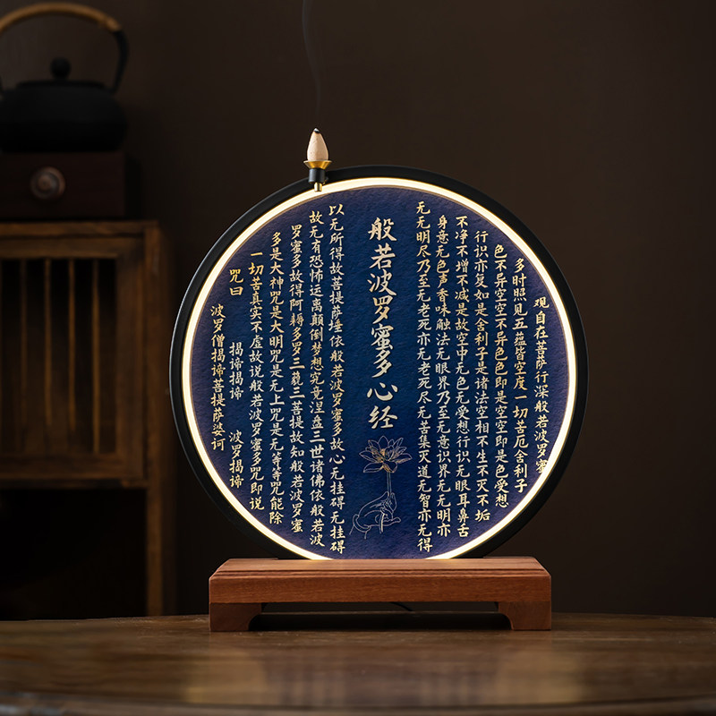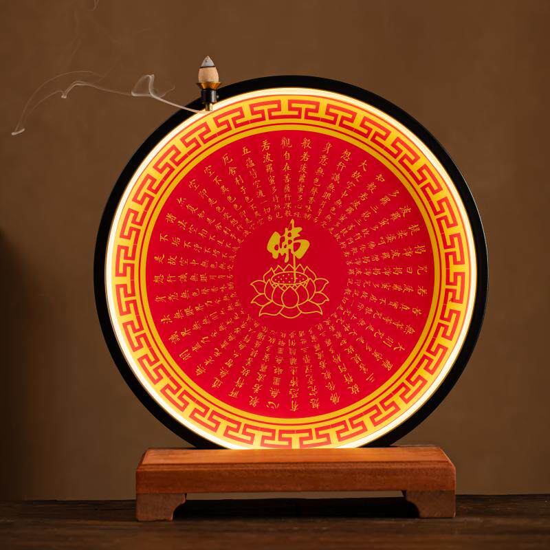新中式LED佛龛背景灯 禅意客厅佛像展示台圆形发光般若心经灯摆件
