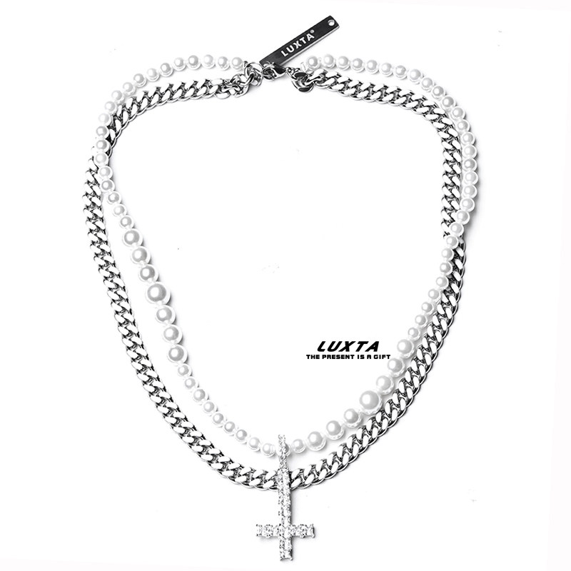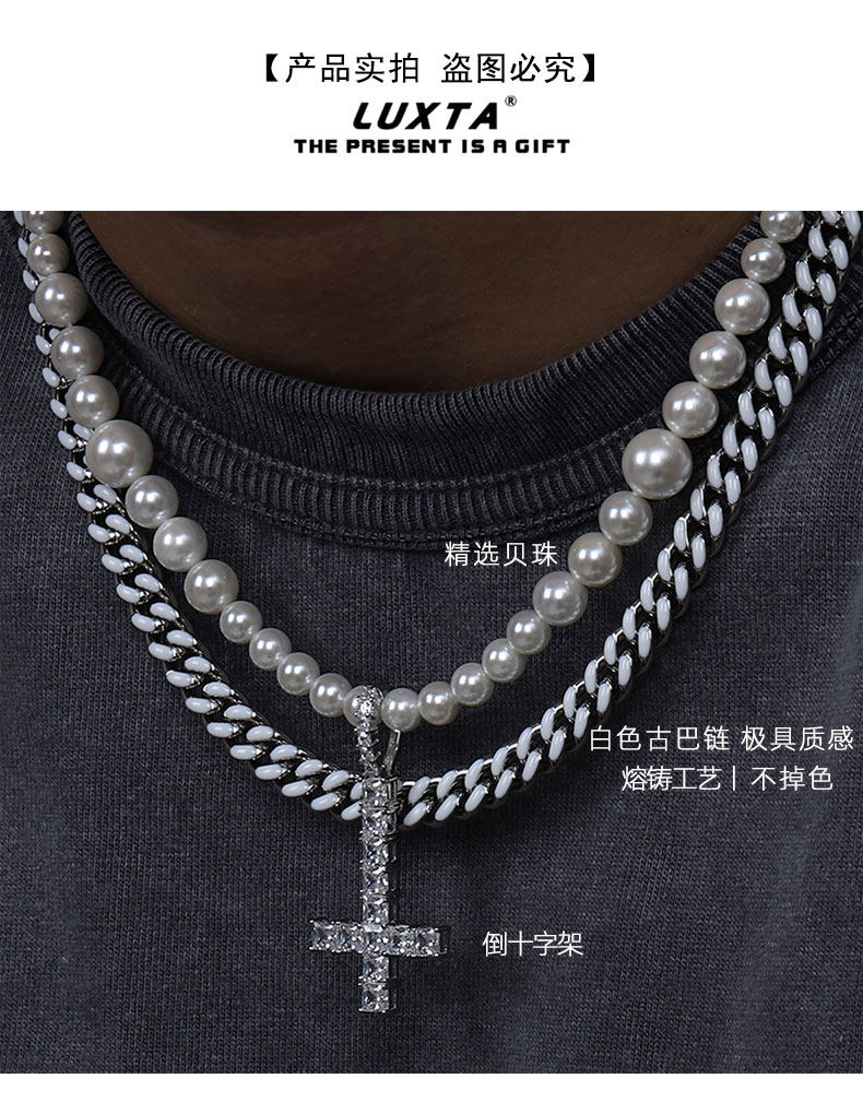 LUXTA原创 珍珠白色古巴链层叠项链十字架吊坠嘻哈男女锁骨毛衣链