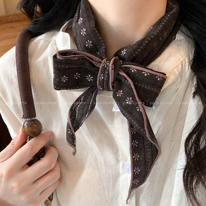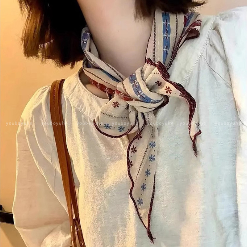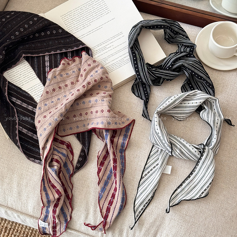 复古文艺条纹棉麻丝巾女出游护颈装饰三角巾系脖领巾日韩百搭围脖