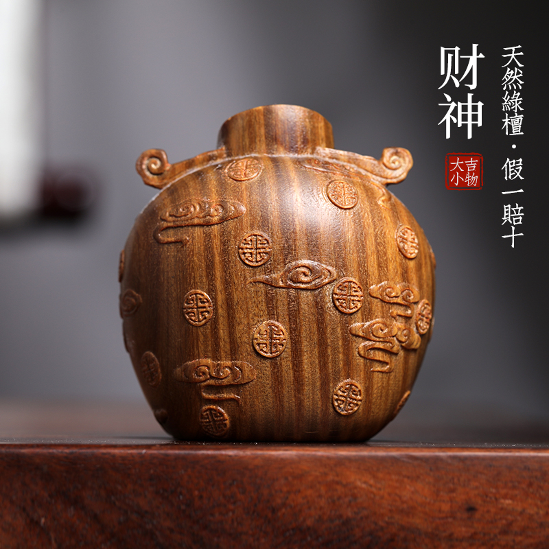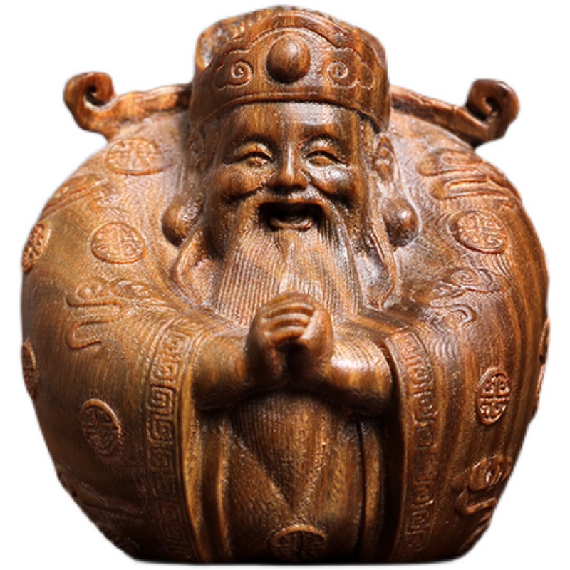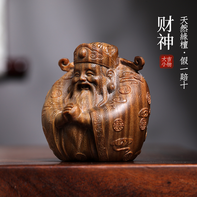 天然绿檀木雕小财神招财好运文玩手把件家居装饰品桌面工艺品摆件
