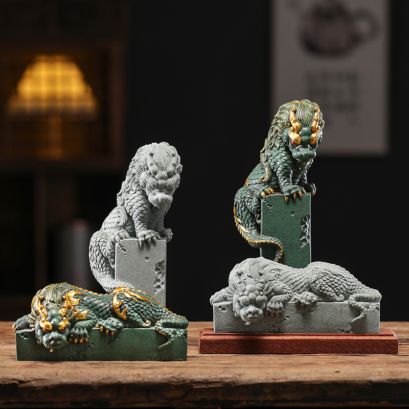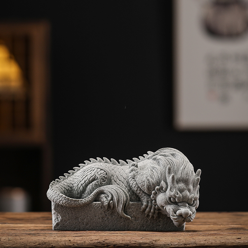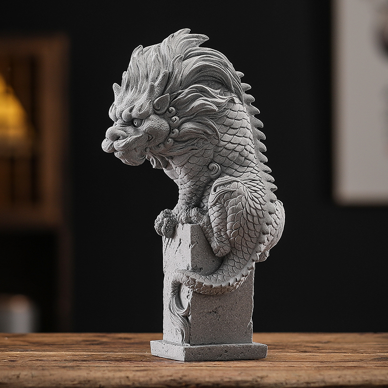 国潮风青砂石盘龙柱麒麟摆件创意家居玄关庭院鱼缸沉水造景装饰品