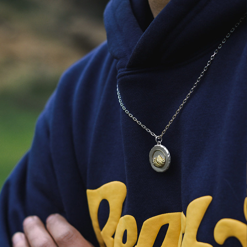 黄铜镀银复古圆牌高山吊坠手工山系山谷潮流高级感项链中性百搭款