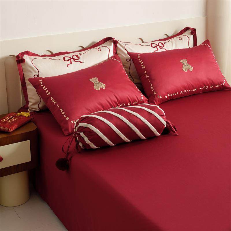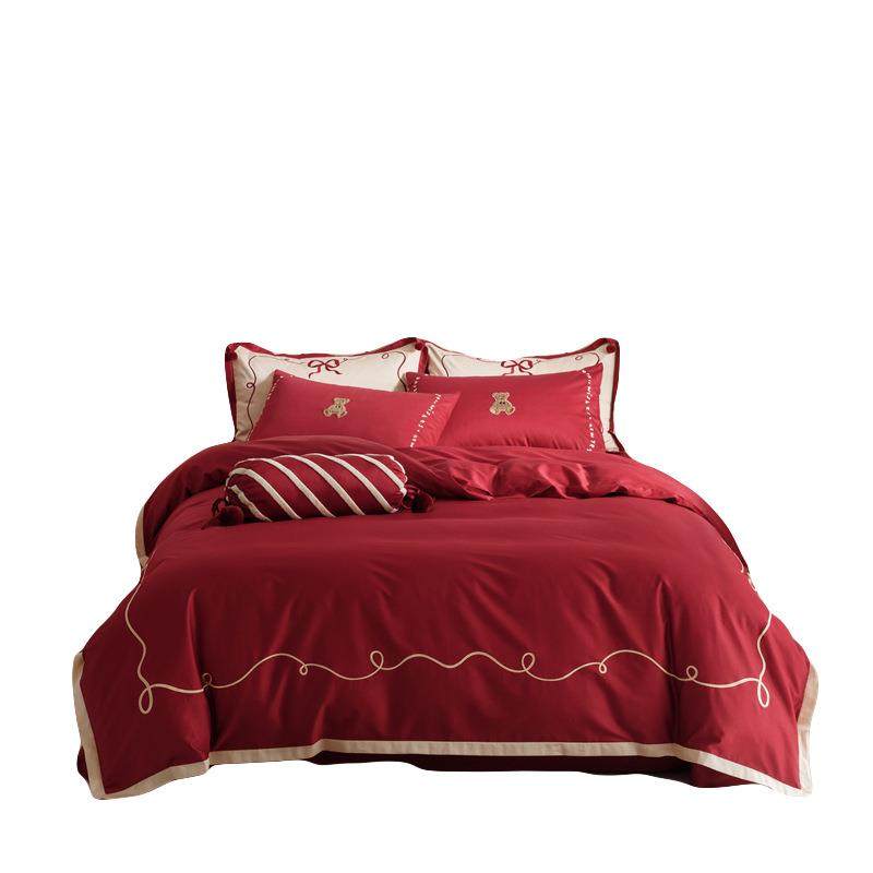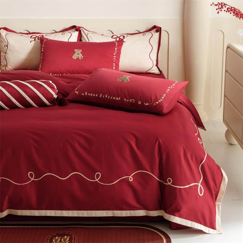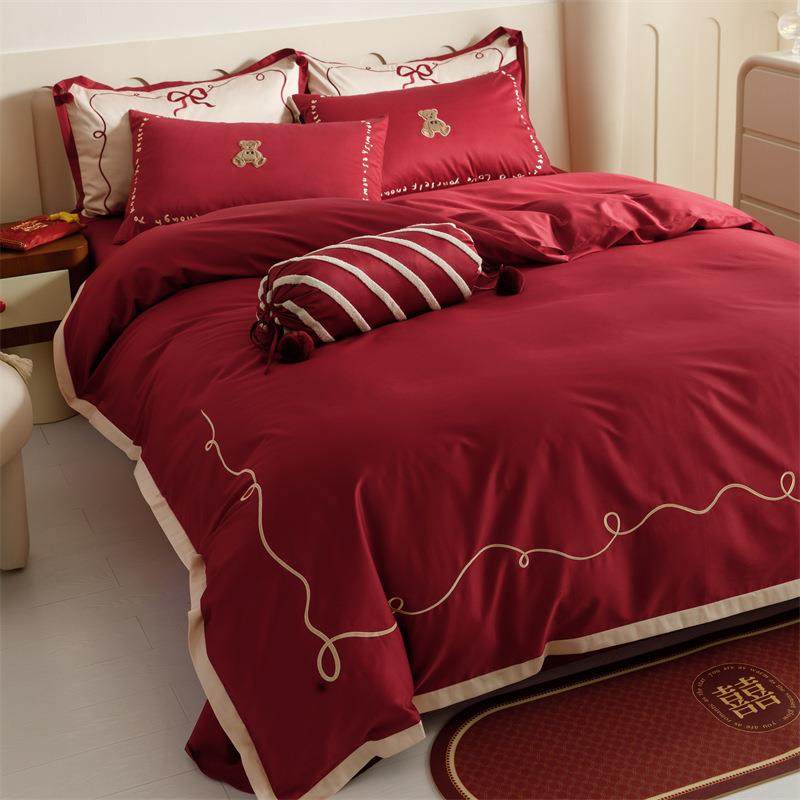 浪漫婚庆100s长绒棉四件套刺绣纯棉结婚被套红色床单1.5床上用品