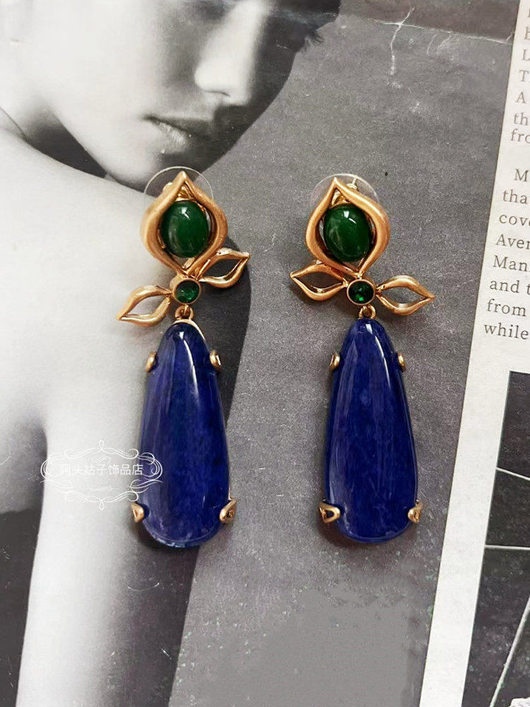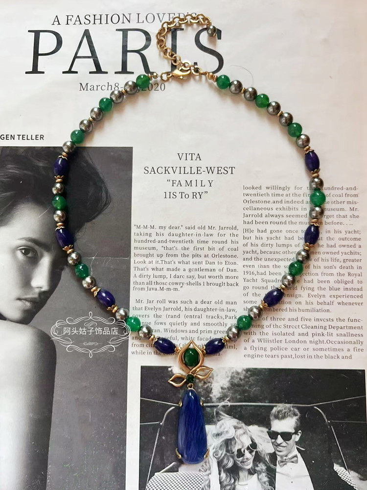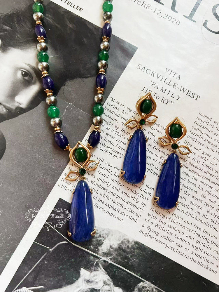欧美宫廷风中古vintage复古气质蓝绿色水滴天然石珍珠项链耳环女