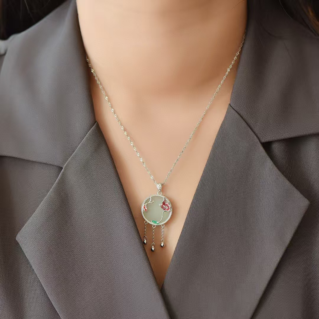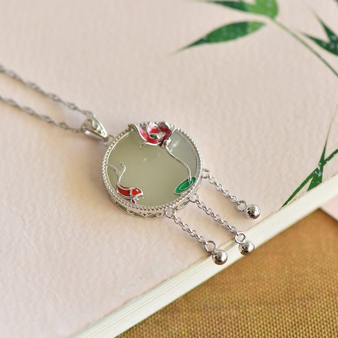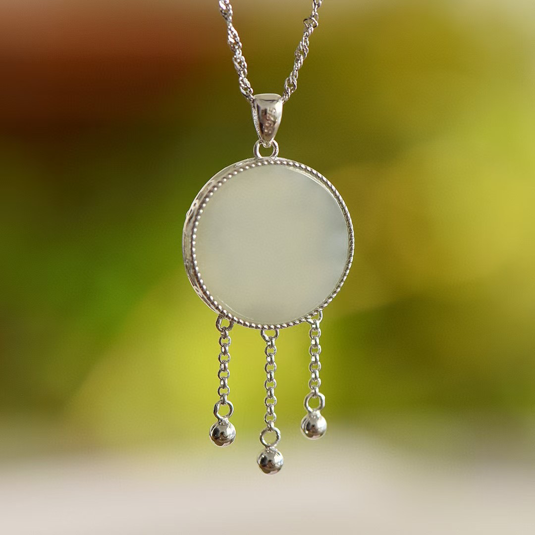 925纯银镶嵌和田玉银镶和田玉圆平面荷荷美美莲花流苏吊坠18*18